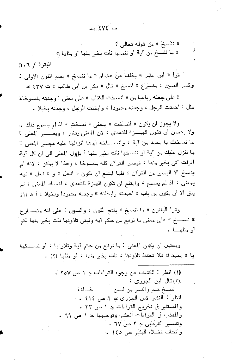 ولا يجوز أن يكون «أنسخت» بمعنى «نسخت» اذ لم يسمع ذلك. ولا يحسن أن تكون الهمزة للتعدي، لان المعنى يتغير، ويصير المعنى: ما نسختك يا محمد من آية، وانساخه اياها إنزالها عليه فيصير المعنى: ما ننزل عليك من آية أو ننسخها نأت بخير منها: يؤول المعنى الى أن كل آية أنزلت أتى بخير منها، فيصير القرآن كله منسوخا، وهذا لا يمكن، لانه لم ينسخ الا اليسير من القرآن، فلما امتنع أن يكون «أفعل» و «فعل» فيه بمعنى، اذ لم يسمع، وامتنع أن تكون الهمزة للتعدي، لفساد المعنى، لم يبق الا أن يكون من باب «أحمدته وأبخلته» وجدته محمودا وبخيلا» أهـ (¬2).