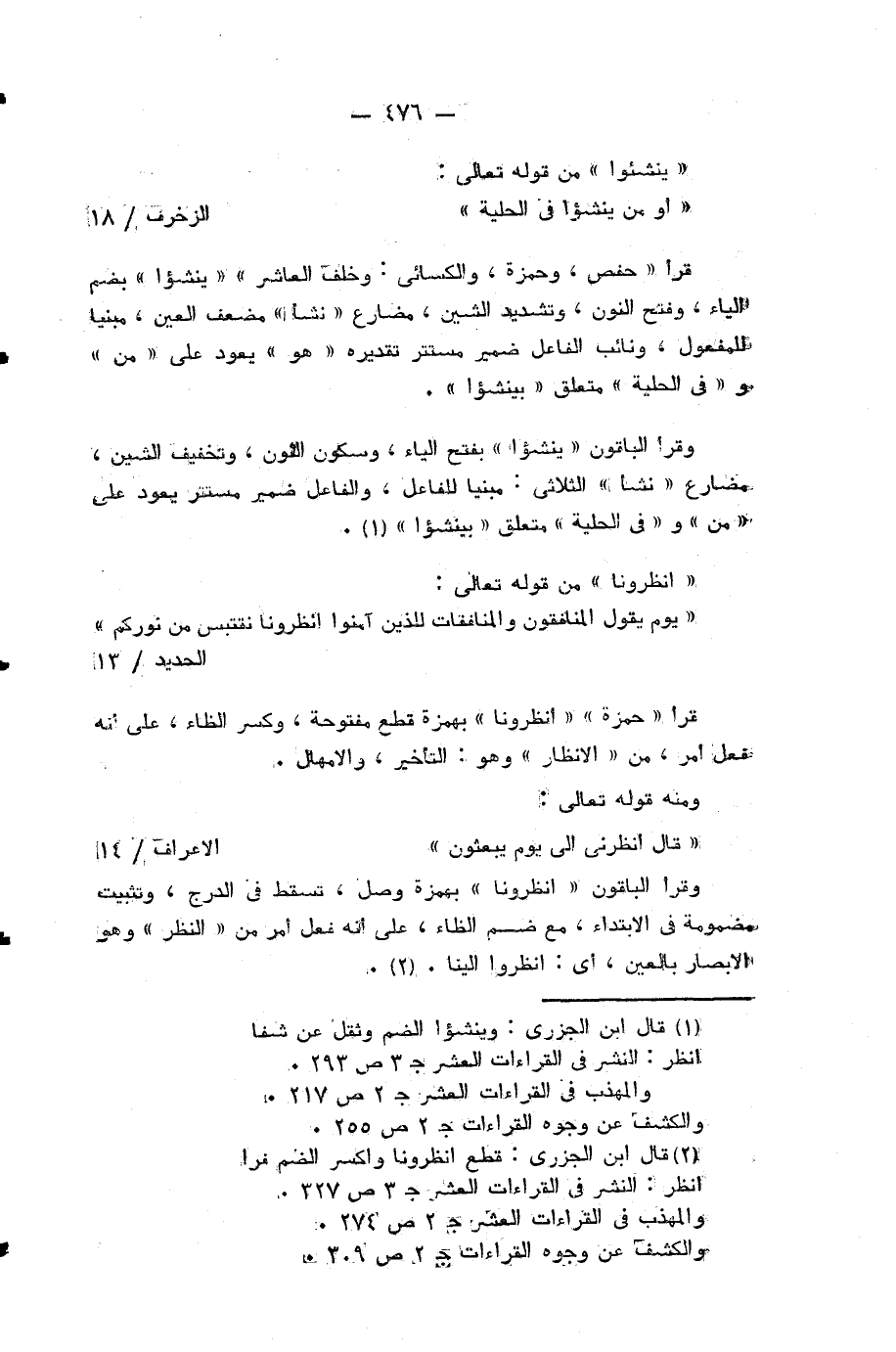 وقرأ الباقون «ينشؤا» بفتح الياء، وسكون النون، وتخفيف الشين، مضارع «نشأ» الثلاثي: مبنيا للفاعل، والفاعل ضمير مستتر يعود على «من» و «في الحلية» متعلق ب «ينشئوا» (¬2).