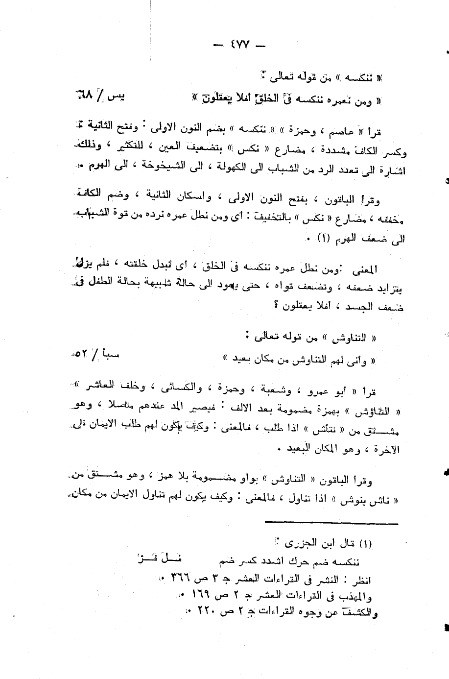 وقرأ الباقون، بفتح النون الاولى، واسكان الثانية، وضم الكاف مخففة، مضارع «نكس» بالتخفيف: أي ومن نطل عمره نرده من قوة الشباب الى ضعف الهرم. (¬2)