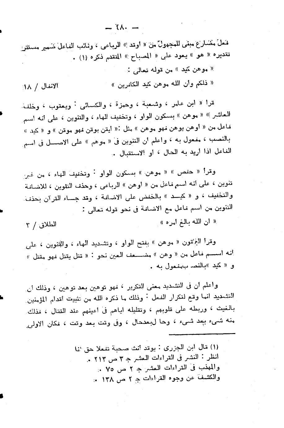 وقرأ «حفص» «موهن» بسكون الواو: وتخفيف الهاء، من غير تنوين، على أنه اسم فاعل من «أوهن» الرباعى، وحذف التنوين، للاضافة والتخفيف، و «كيد» بالخفض على الاضافة، وقد جاء القرآن بحذف التنوين من اسم فاعل مع الاضافة في نحو قوله تعالى: «إِنَّ اللَّهَ بالِغُ أَمْرِهِ». (¬3)