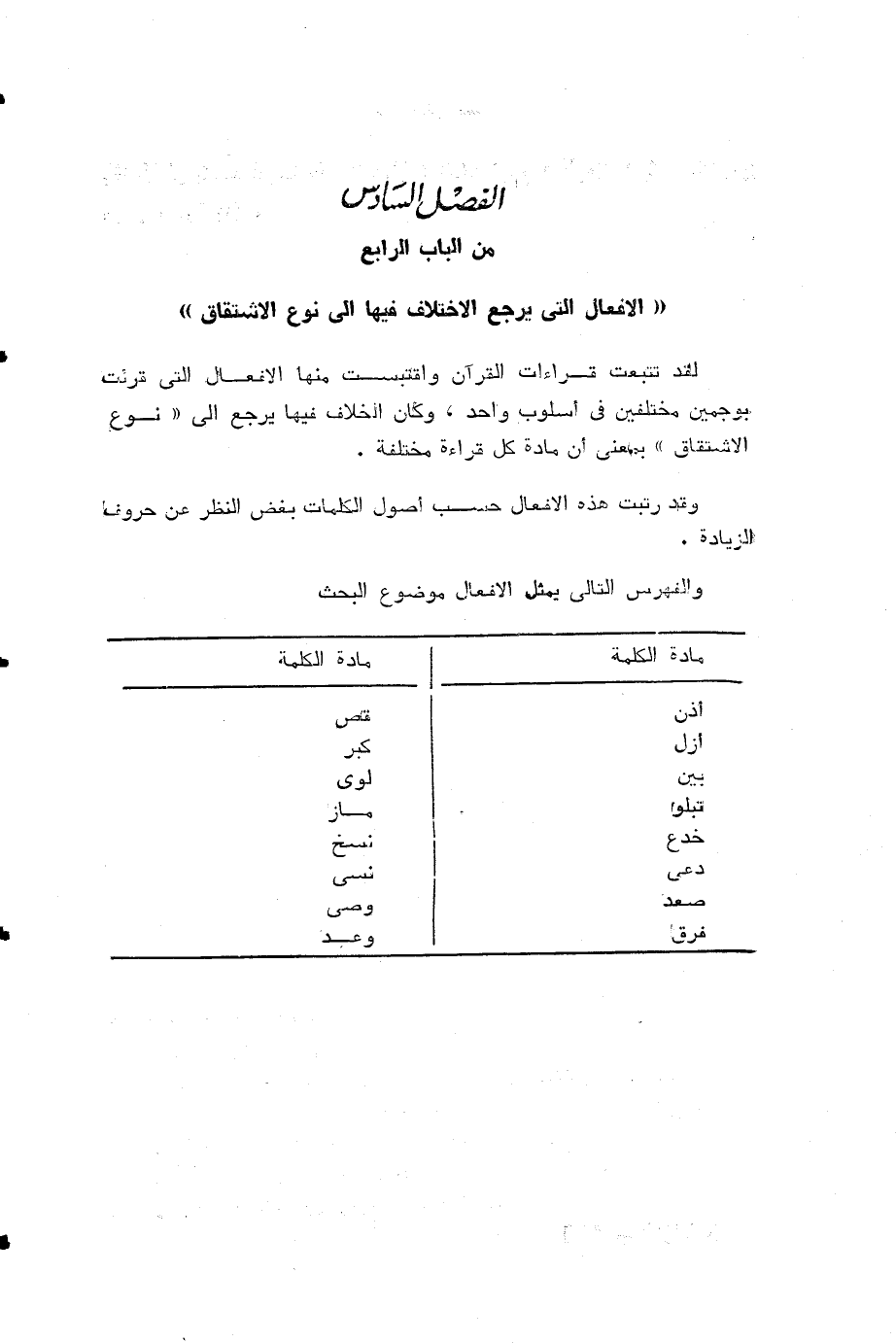 لقد تتبعت قراءات القرآن واقتبست منها الافعال التي قرئت بوجهين مختلفين في أسلوب واحد، وكان الخلاف فيها يرجع الى «نوع الاشتقاق» بمعنى أن مادة كل قراءة مختلفة.