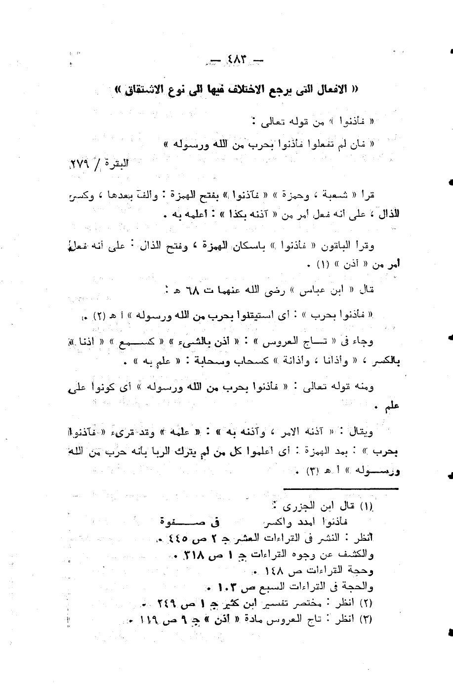 الأفعال التي يرجع الاختلاف فيها الى نوع الاشتقاق «فأذنوا» من قوله تعالى: فَإِنْ لَمْ تَفْعَلُوا فَأْذَنُوا بِحَرْبٍ مِنَ اللَّهِ وَرَسُولِهِ (¬1).