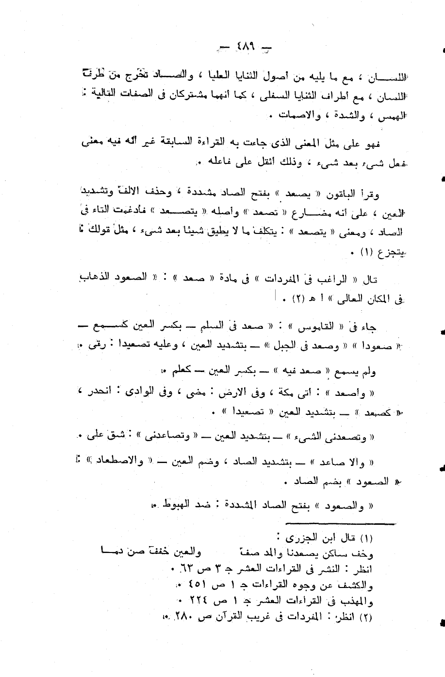وقرأ الباقون «يصعد» بفتح الصاد مشددة، وحذف الالف وتشديد العين، على أنه مضارع «تصعد» وأصله «يتصعد» فأدغمت التاء في الصاد، ومعنى «يتصعد»: يتكلف ما لا يطيق شيئا بعد شيء، مثل قولك: يتجزع (¬1).