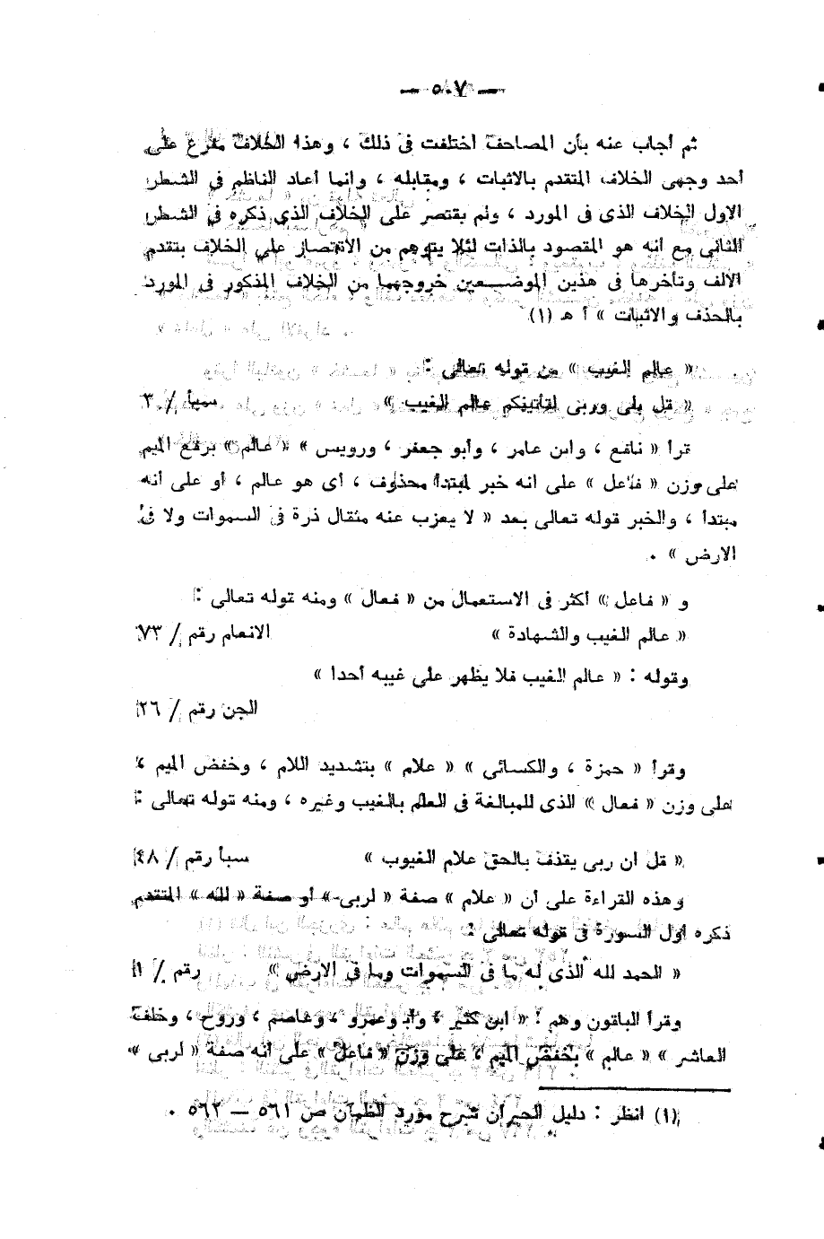 ثم أجاب عنه بأن المصاحف اختلفت في ذلك، وهذا الخلاف مفرع على أحد وجهي الخلاف المتقدم بالاثبات، ومقابله، وانما أعاد الناظم في الشطر الاول الخلاف الذي في المورد، ولم يقتصر على الخلاف الذي ذكره في الشطر الثاني مع أنه هو المقصود بالذات لئلا يتوهم من الاقتصار على الخلاف بتقدم الالف وتأخرها في هذين الموضعين خروجهما من الخلاف المذكور في المورد بالحذف والاثبات» أهـ (¬1).