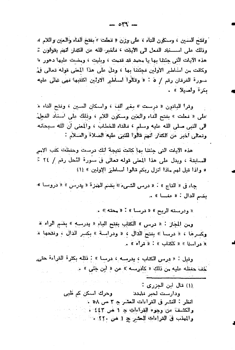 وقرأ الباقون «درست» بغير ألف، واسكان السين، وفتح التاء، على «فعلت» بفتح الفاء والعين وسكون اللام، وذلك على اسناد الفعل الى النبي صلى الله عليه وسلم، فالتاء للخطاب، والمعنى أن الله سبحانه وتعالى أخبر عن الكفار أنهم قالوا للنبي عليه الصلاة والسلام: