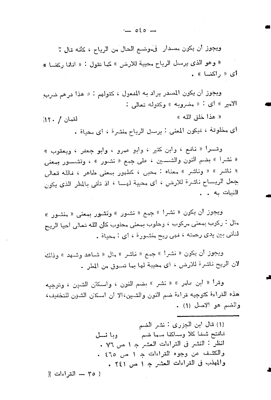 وقرأ «نافع، وابن كثير، وأبو عمرو، وأبو جعفر، ويعقوب» «نشرا» بضم النون والشين، على جمع «نشور»، ونشور بمعنى «ناشر» «وناشر» معناه: محيى، كطهور بمعنى طاهر، فالله تعالى جعل الرياح ناشرة للارض، أي محيية لها، اذ تأتي بالمطر الذي يكون النبات به ..