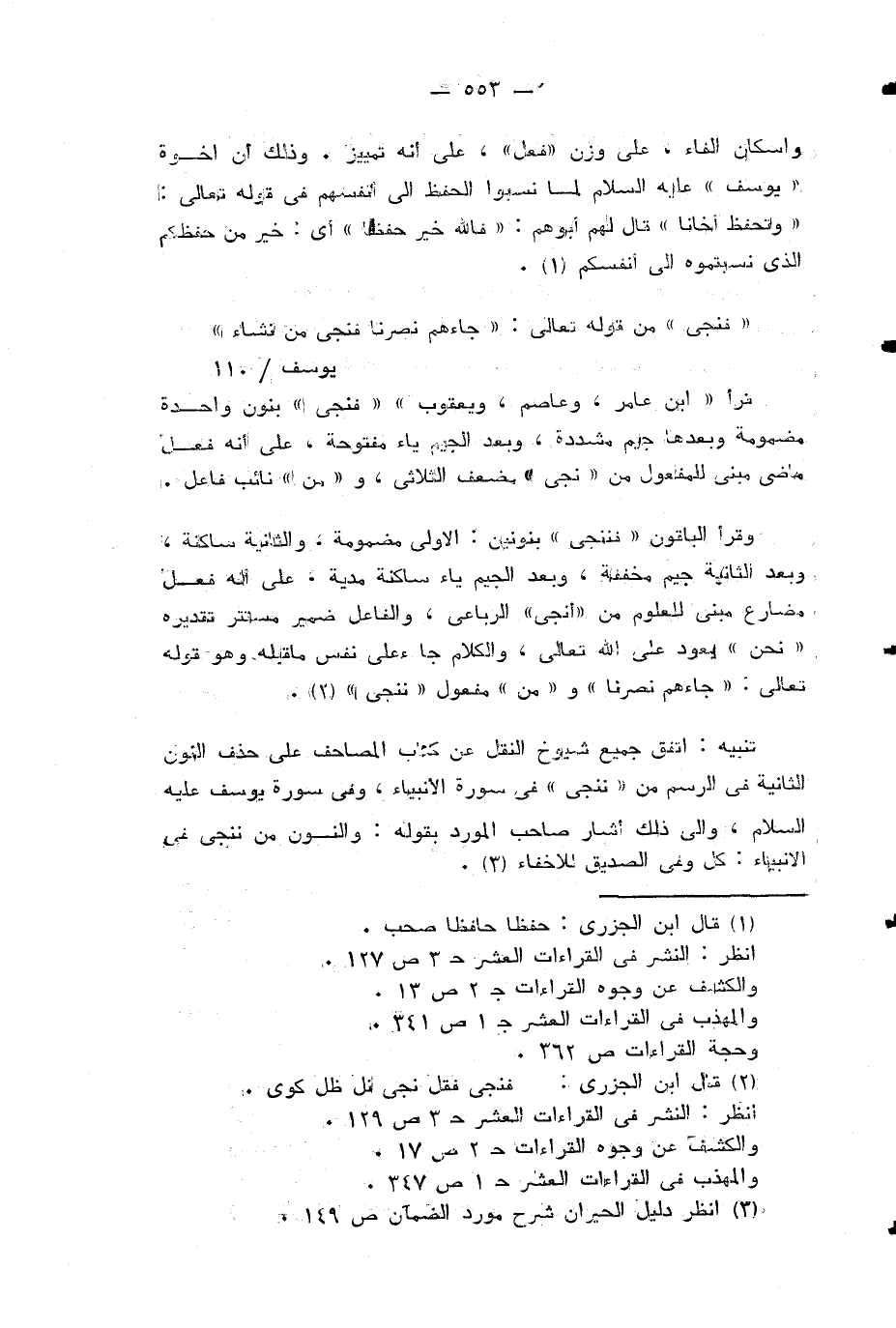 تنبيه: اتفق جميع شيوخ النقل عن كتاب المصاحف على حذف النون الثانية في الرسم من «ننجي» في سورة الأنبياء، وفي سورة يوسف عليه السلام، والى ذلك أشار صاحب المورد بقوله: والنون من ننجي في الانبياء: