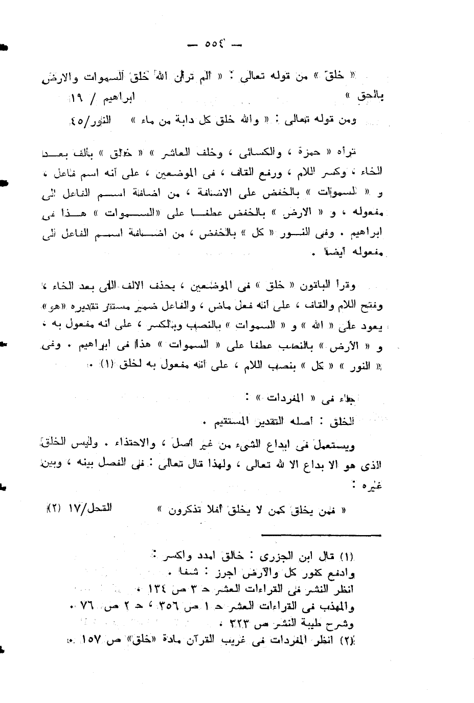 وقرأ الباقون «خلق» في الموضعين، بحذف الالف التي بعد الخاء، وفتح اللام والقاف، على أنه فعل ماض، والفاعل ضمير مستتر تقديره «هو» يعود على «الله» و «السموات» بالنصب وبالكسر، على أنه مفعول به، و «الأرض» بالنصب عطفا على «السموات» هذا في إبراهيم. وفي «النور» «كل» بنصب اللام، على أنه مفعول به لخلق (¬3).
