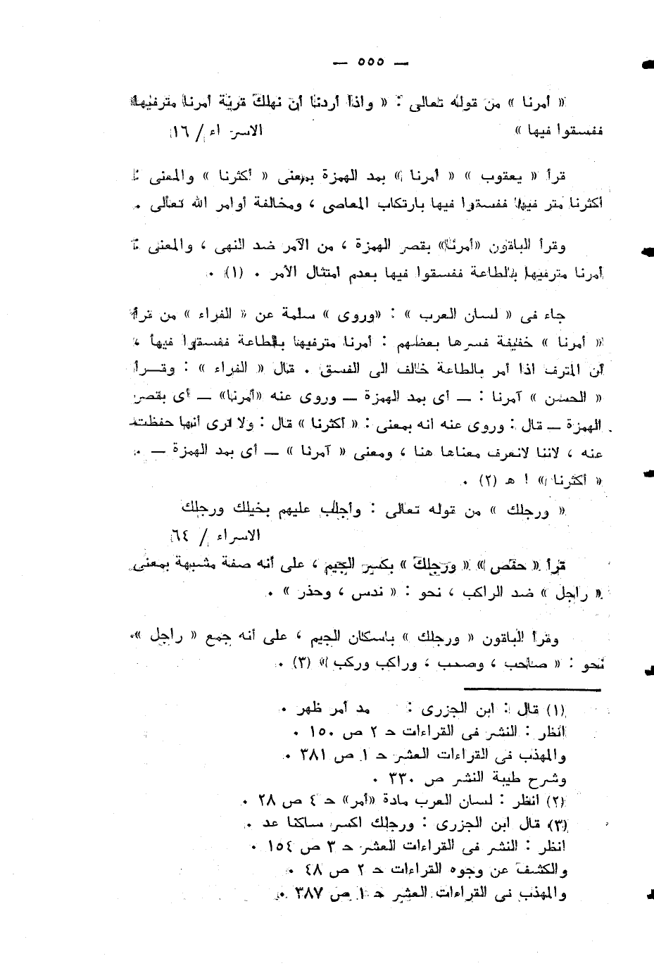 جاء في «لسان العرب»: وروى «سلمة» عن «الفراء» من قرأ «أمرنا» خفيفة فسرها بعضهم: أمرنا مترفيها بالطاعة ففسقوا فيها، أن المترف اذا أمر بالطاعة خالف الى الفسق. قال «الفراء»: وقرأ «الحسن» آمرنا:- أي بمد الهمزة- وروي عنه «أمرنا» - أي بقصر الهمزة- قال: وروي عنه أنه بمعنى: «أكثرنا» قال: ولا أدري أنها حفظت عنه، لاننا لا نعرف معناها هنا، ومعنى «آمرنا» - أي بمد الهمزة-. «أكثرنا» اهـ (¬3).