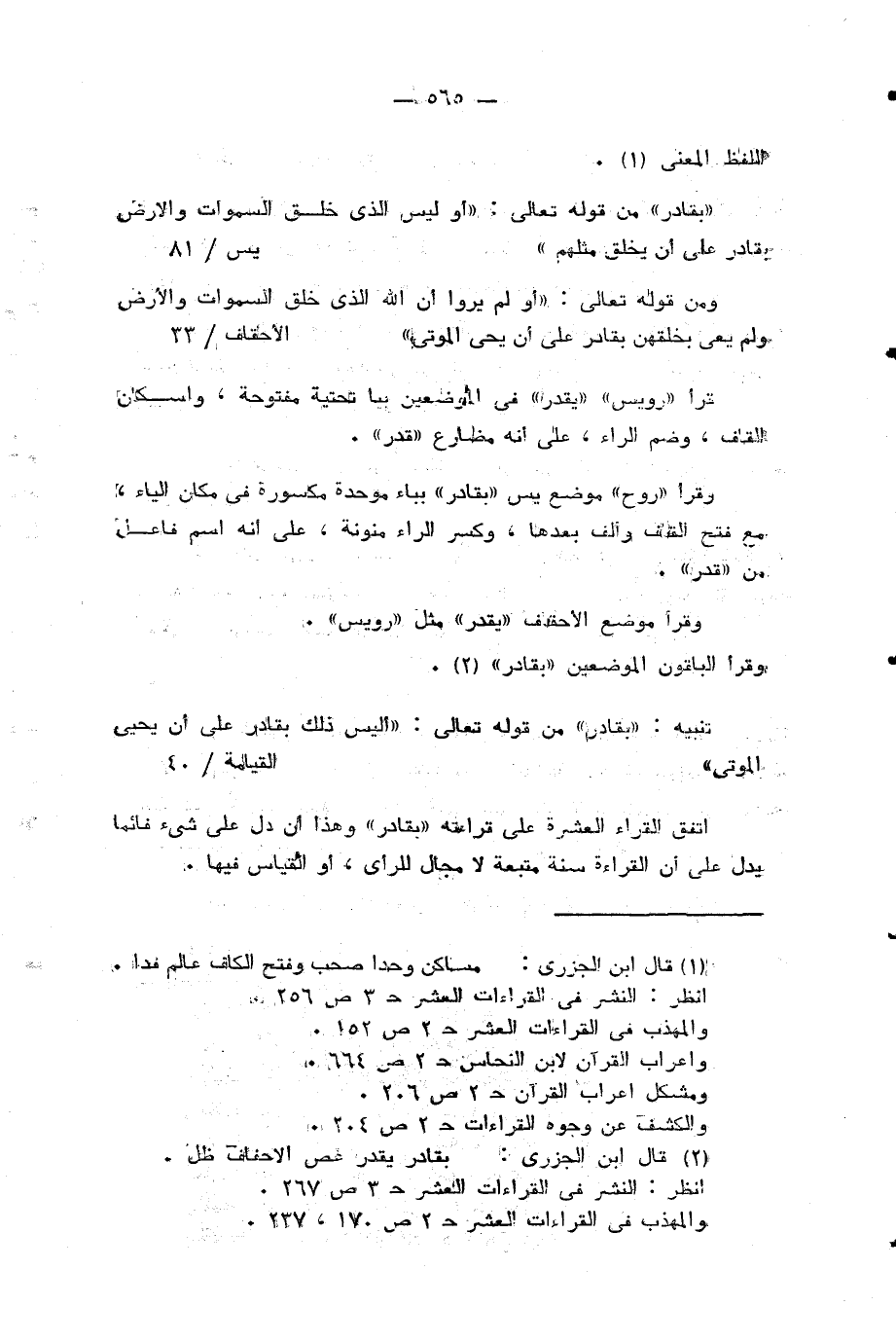 اتفق القراء العشرة على قراءته «بقادر» وهذا أن دل على شيء فانما يدل على أن القراءة سنة متبعة لا مجال للرأي، أو القياس فيها.