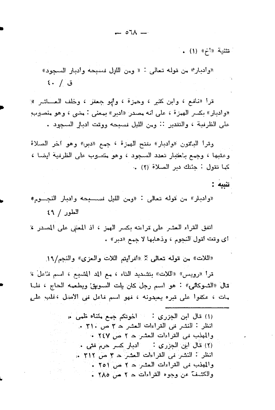 تنبيه: «وادبار» من من قوله تعالى: وَمِنَ اللَّيْلِ فَسَبِّحْهُ وَإِدْبارَ النُّجُومِ (¬4).