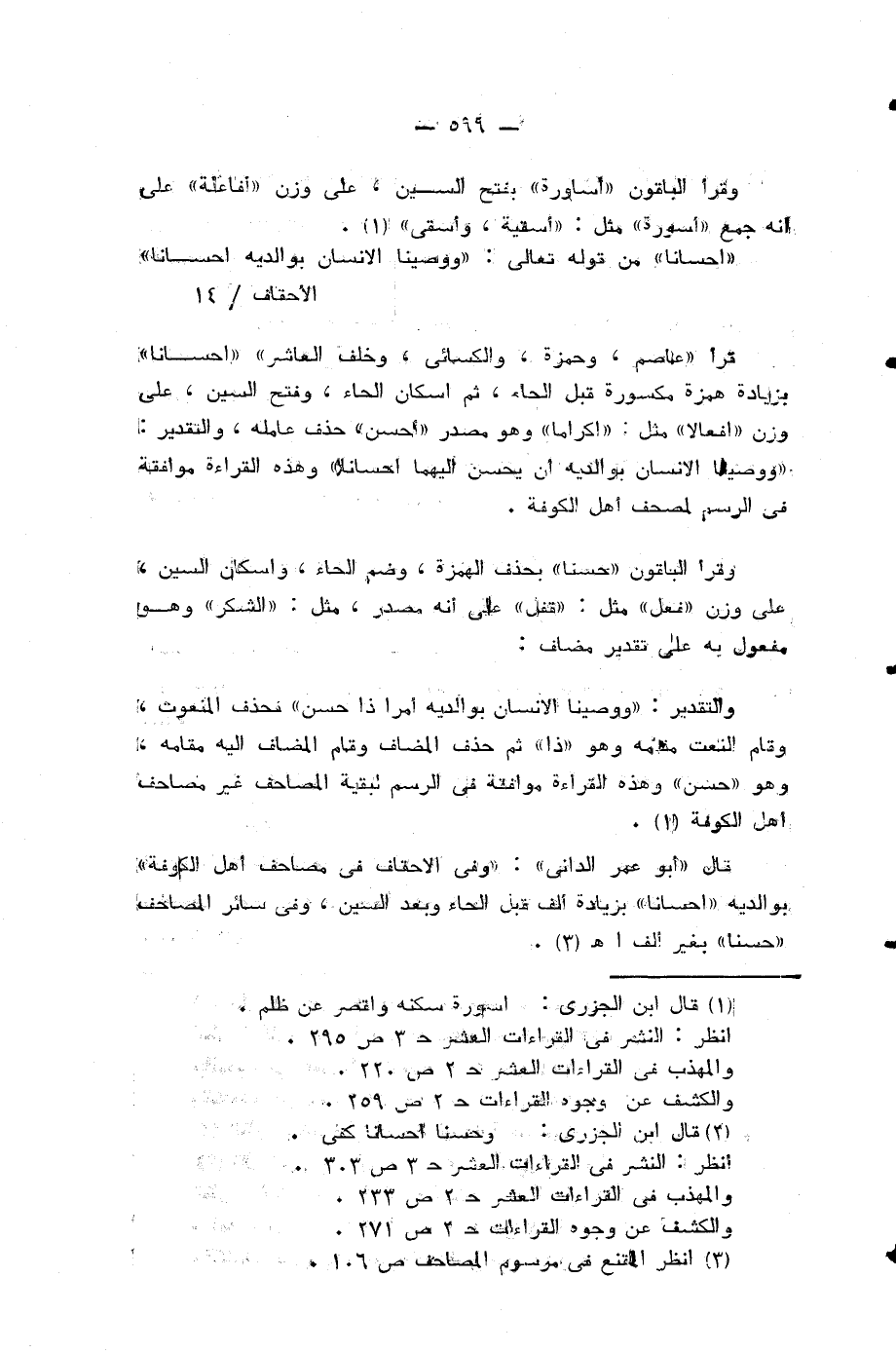 قال «أبو عمر الداني»: «وفي الاحقاف في مصاحف أهل الكوفة» بوالديه «احسانا» بزيادة ألف قبل الحاء وبعد السين، وفي سائر المصاحف «حسنا» بغير ألف أهـ (¬4).