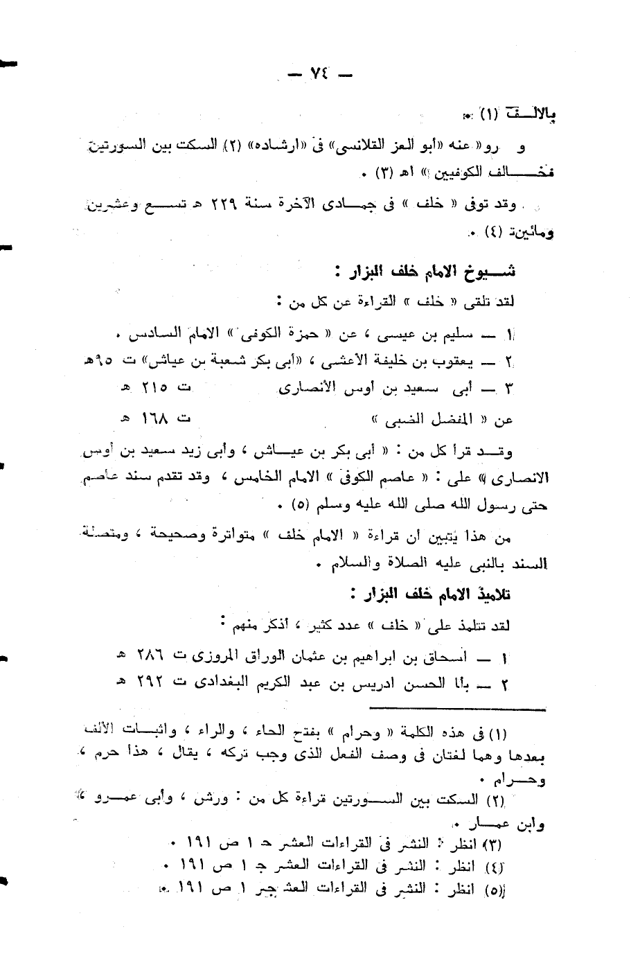 وروى عنه ابو العز القلانسي» في «ارشاده» (¬2) السكت بين السورتين فخالف الكوفيين» اهـ (¬3).