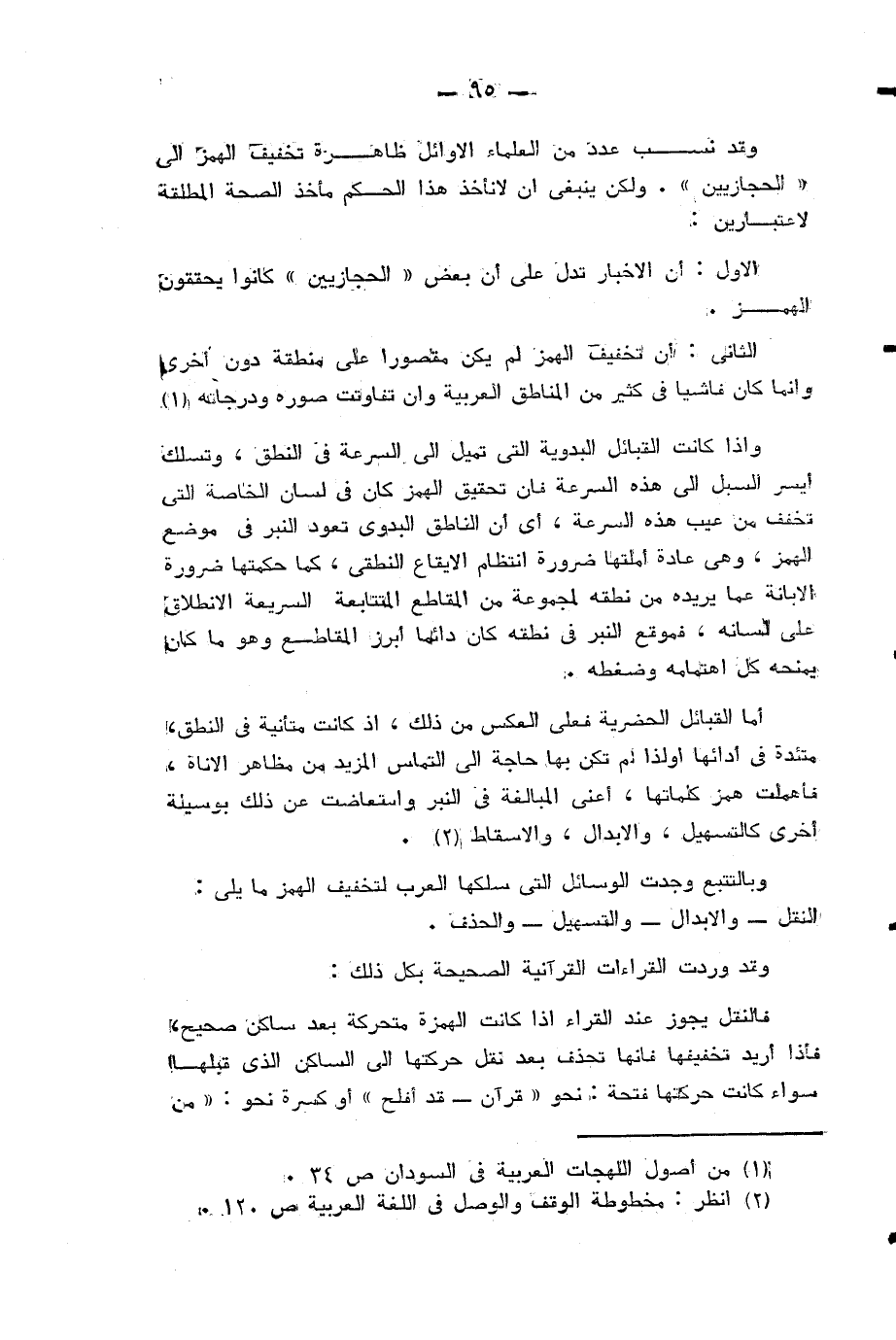 اما القبائل الحضرية فعلى العكس من ذلك، اذ كانت متأنية في النطق، متئدة في ادائها او إذا لم تكن بها حاجة الى التماس المزيد من مظاهر الاناة، فأهملت همز كلماتها، أعني المبالغة في النبر واستعاضت عن ذلك بوسيلة اخرى كالتسهيل، والابدال، والاسقاط (¬2).