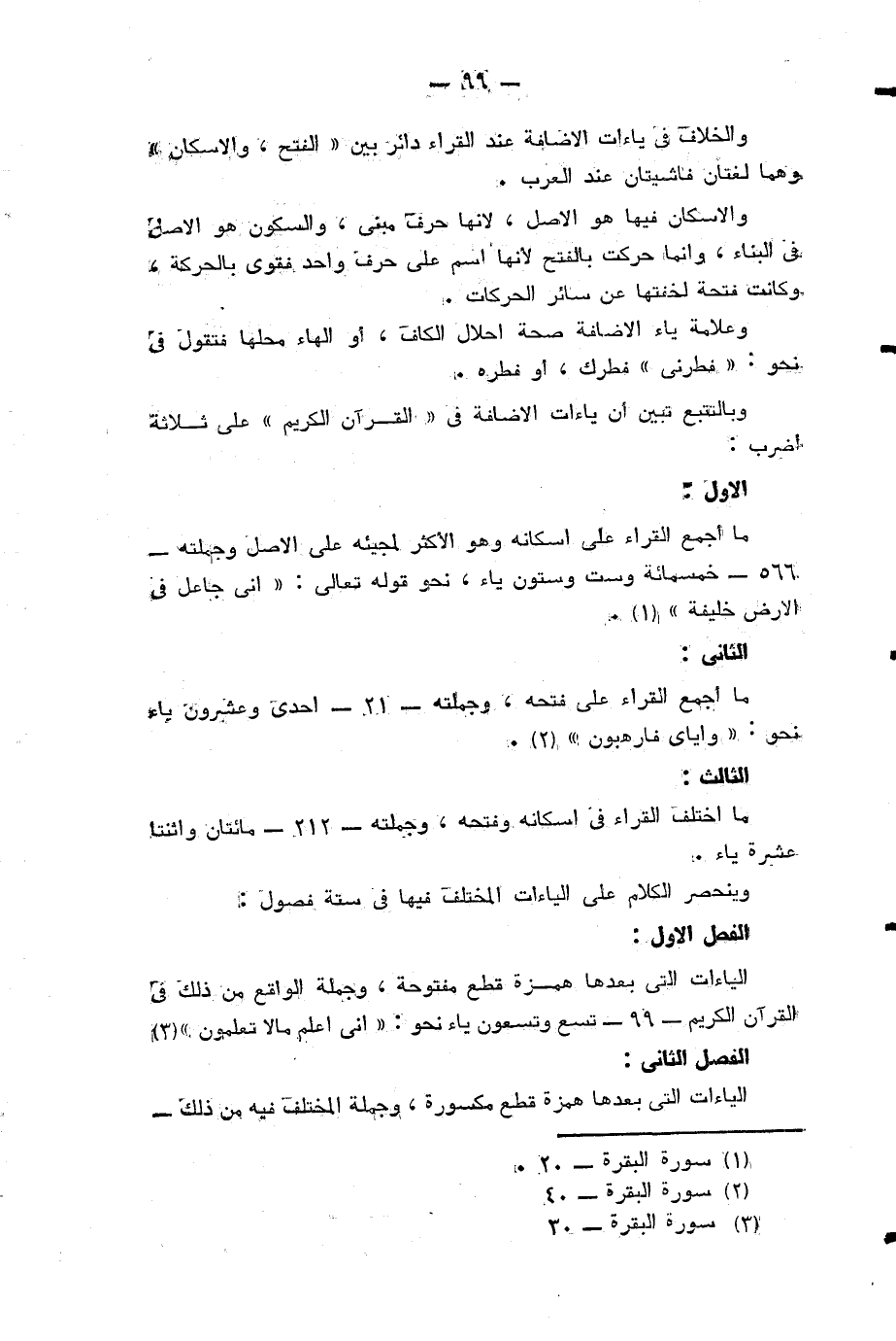 وبالتتبع تبين ان ياءات الاضافة في «القرآن الكريم» على ثلاثة اضرب: