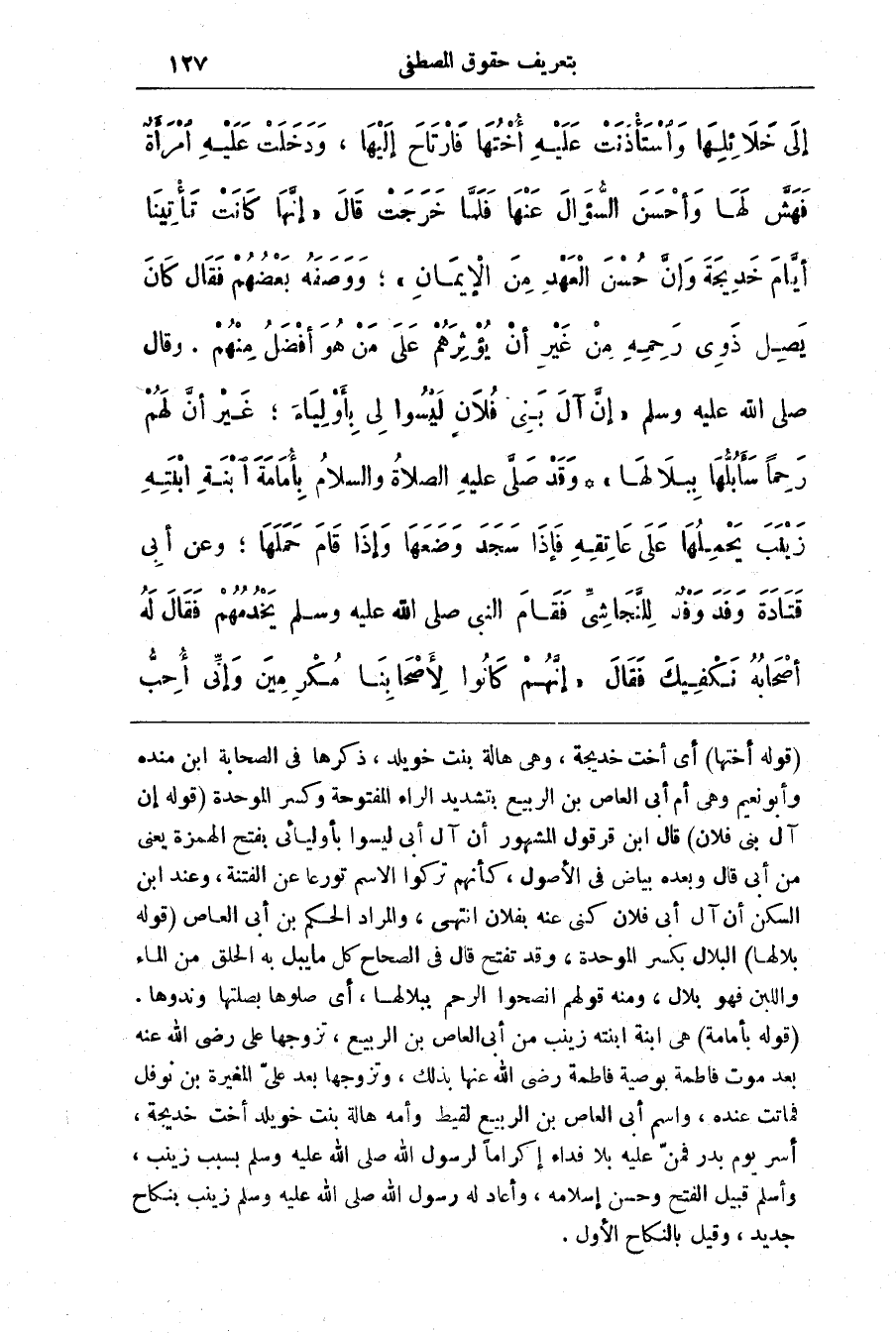 وَقَالَ صَلَّى اللَّهُ عَلَيْهِ وَسَلَّمَ (إِنَّ آلَ بَنِي فُلَانٍ لَيْسُوا لِي بِأَوْليَاءَ، غَيْرَ أَنَّ لَهُمْ رَحِمًا سَأَبُلُّهَا بِبَلالِهَا) * وَقَدْ صَلَّى عَلَيْهِ الصَّلَاةُ وَالسَّلَامُ بِأُمَامَةَ ابْنَةِ ابْنَتِهِ زَيْنَبَ يَحْمِلُهَا عَلَى عَاتِقِهِ فَإِذَا سَجَدَ وَضَعَهَا وَإِذَا قَامَ حَمَلَهَا، وَعَنْ أَبِي قَتَادَةَ وَفَدَ وَفْدٌ لِلنَّجَاشِيِّ فَقَامَ النَّبِيُّ صَلَّى اللَّهُ عَلَيْهِ وَسَلَّمَ يَخْدُمُهُمْ فَقَالَ لَهُ أَصْحَابُهُ نَكْفِيكَ فَقَالَ (إِنَّهُمْ كَانُوا لِأَصْحَابِنَا مُكْرِمِينَ وإنى أحب