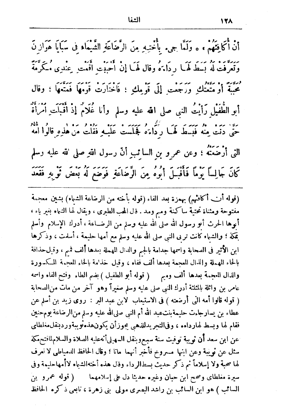 أَنْ أُكَافِئَهُمْ) * وَلَمَّا جئ بِأُخْتِهِ مِنَ الرَّضَاعَةِ الشَّيْمَاءِ فِي سَبَايَا هَوَازِنَ وَتَعَرَّفَتْ لَهُ بَسَطَ لَهَا رِدَاءَهُ وَقَالَ لَهَا إنْ أَحْبَبْتِ أَقَمْتِ عِنْدِي مُكَرَّمَةً مُحَبَّبَةً أَوْ مَتَّعْتُكِ وَرَجَعْتِ إِلَى قَوْمِكِ، فَاخْتَارَتْ قَوْمَهَا فَمَتَّعَهَا، وَقَالَ أَبُو الطُّفَيْلِ رَأَيْتُ النَّبِيَّ صَلَّى اللَّهُ عَلَيْهِ وَسَلَّمَ وَأَنَا غُلامٌ إِذْ أَقْبَلَتِ امْرَأةٌ حَتَّى دَنَتْ مِنْهُ فَبَسَطَ لَهَا رِدَاءَهُ فَجَلَسَتْ عَلَيْهِ فَقُلْتُ مَنْ هَذِهِ قَالُوا أُمُّهُ الَّتِي أَرْضَعَتْهُ، وَعَنْ عَمْرِو بْنِ السَّائِبِ أَنَّ رَسُولَ اللَّهِ صَلَّى اللَّهُ عَلَيْهِ وَسَلَّمَ كَانَ جَالِسًا يَوْمًا فَأَقْبَلَ أَبُوهُ مِنَ الرَّضَاعَةِ فَوَضَعَ لَهُ بَعْضَ ثوبه فقعد