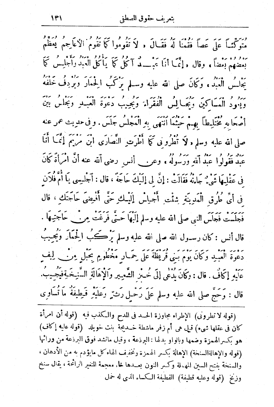عَبْدٌ فَقُولُوا عَبْدُ اللَّهِ وَرَسُولُهُ) وَعَنْ أَنَسٍ رَضِيَ اللَّهُ عَنْهُ أَنَّ امْرَأَةً كَانَ فِي عَقْلِهَا شئ جَاءَتْهُ فَقَالَتْ: إِنَّ لِي إِلَيْكَ حَاجَةً، قَالَ: اجْلِسِي يَا أُمَّ فُلَانٍ فِي أَيِّ طُرُقِ الْمَدِينَةِ شِئْتِ أَجْلِسُ إِلَيْكِ حَتَّى أقْضِي حَاجَتَكِ، قَالَ فَجَلَسَتْ فَجَلَسَ النَّبِيُّ صَلَّى اللَّهُ عَلَيْهِ وَسَلَّمَ إِلَيْهَا حَتَّى فَرَغَتْ مِنْ حَاجَتِهَا.