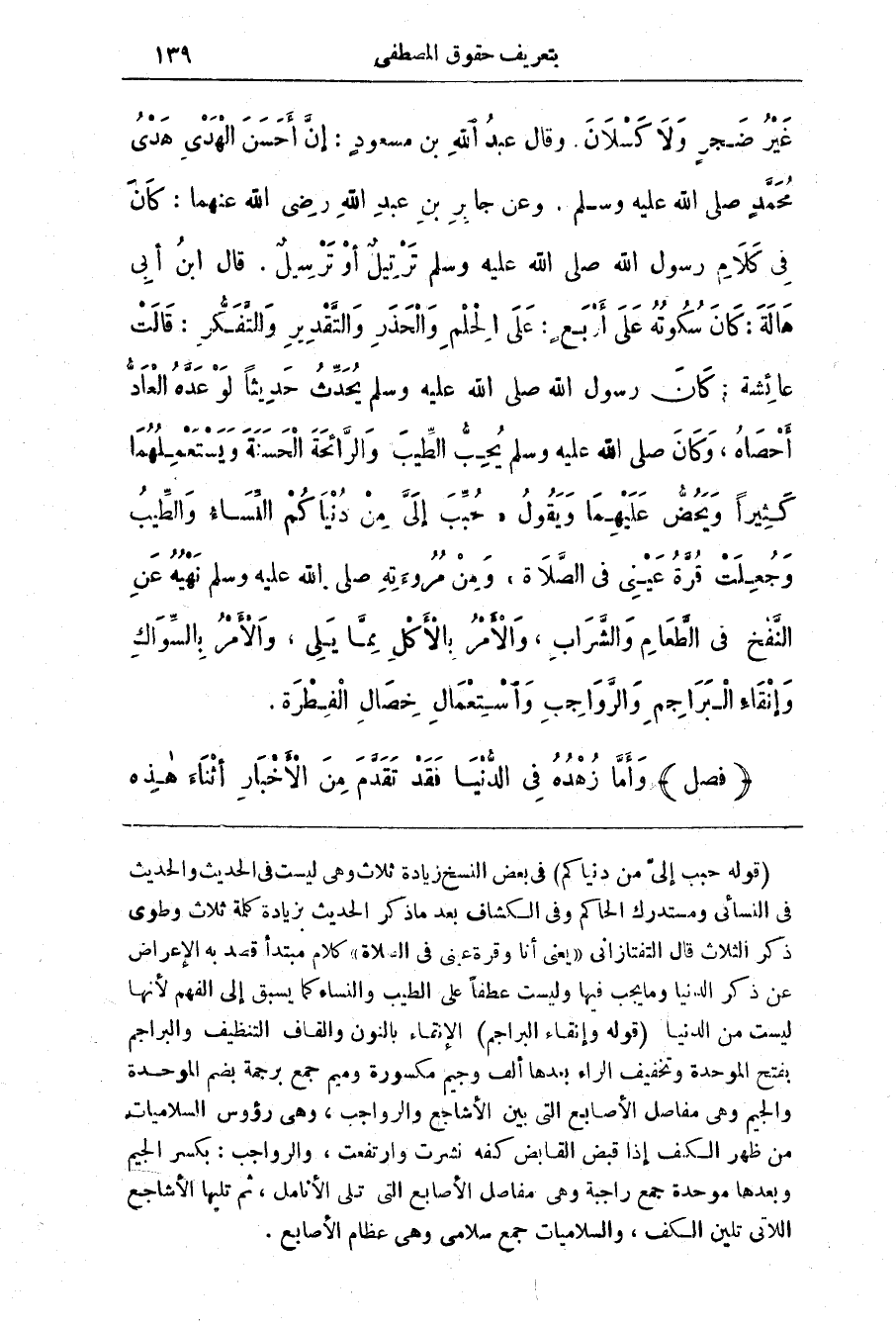 (قوله حبب من دنياكم) في بعض النسخ زيادة ثلاث وهى ليست في الحديث والحديث في النسائي ومستدرك الحاكم وفى الكشاف بعد ما ذكر الحديث بزيادة كلمة ثلاث وطوى ذكر الثلاث قال التفتازانى (يعنى أنا وَقُرَّةُ عَيْنِي فِي الصلاة) كلام مبتدا قصد به الإعراض عن ذكر الدنيا وما يجب فيها وليست عطفا على الطيب والنساء كما يسبق إلى الفهم لأنها ليست من الدنيا (قوله وإنقاء البراجم) الإنقاء بالنون والقاف التنظيف والبراجم بفتح الموحدة وتخفيف الراء بعدها ألف وجيم مكسورة وميم جمع برجمة بضم الموحدة والجيم وهى مفاصل الأصابع التى بين الأشاجع والرواجب، وهى رؤوس السلاميات من ظهر الكف إذا قبض القابض كفه نشرت وارتفعت، والرواجب: بكسر الجيم وبعدها موحدة جمع راجبة وهى مفاصل الأصابع التى تلى الأنامل، ثم تليها الأشاجع اللاتى تلين الكف، والسلاميات جمع سلامى وهى عظام الأصابع.