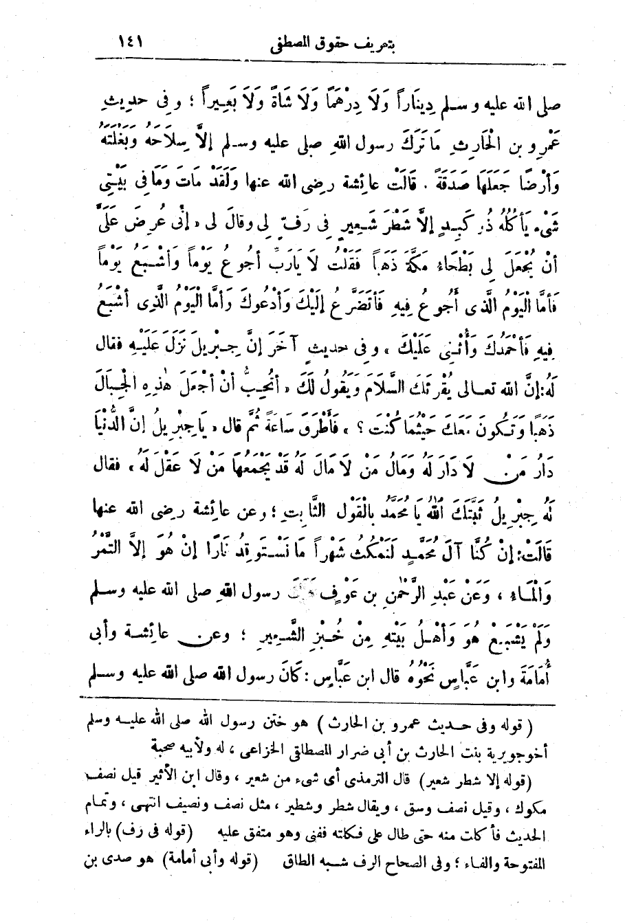 صَلَّى اللَّهُ عَلَيْهِ وَسَلَّمَ دِينَارًا وَلا دِرْهَمًا وَلَا شَاةً وَلَا بَعِيرًا، وَفِي حَدِيثِ عَمْرِو بْنِ الْحَارِثِ مَا تَرَكَ رَسُولُ اللَّهِ صَلَّى اللَّهُ عَلَيْهِ وَسَلَّمَ إِلَّا سِلَاحَهُ وَبَغْلَتَهُ وَأَرْضًا جَعَلَهَا صَدَقَةً، قَالَتْ عَائِشَةُ رَضِيَ اللَّهُ عَنْهَا وَلَقَدْ مَاتَ وَمَا فِي بيتى شئ يَأْكُلُهُ ذُو كَبِدٍ إِلَّا شَطْرَ شَعِيرٍ فِي رَفٍّ لِي وَقَالَ لِي (إِنَّي عُرِضَ عَلَيَّ أَنْ يُجْعَلَ لِي بَطْحَاءُ مَكَّةَ ذَهَبًا فَقُلْتُ لَا يَا رَبِّ أَجُوعُ يَوْمًا وَأَشْبَعُ يَوْمًا فَأَمَّا الْيَوْمَ الَّذِي أَجُوعُ فِيهِ فَأَتَضَرَّعُ إِلَيْكَ وَأَدْعُوكَ وَأَمَّا الْيَوْمَ الَّذِي أَشْبَعُ فِيهِ فَأَحْمَدُكَ وَأُثْنِي عَلَيْكَ) وَفِي حَدِيثٍ آخَرَ أَنَّ جِبْرِيلَ نَزَلَ عَلَيْهِ فَقَالَ لَهُ: إِنَّ اللَّهَ تَعَالَى يُقْرِئُكَ السَّلَامَ وَيَقُولُ لَكَ (أَتُحِبُّ أَنْ أَجْعَلَ هَذِهِ الْجِبَالَ ذَهَبًا وَتَكُونَ مَعَكَ حَيْثُمَا كُنْتَ؟) فَأَطْرَقَ سَاعَةً ثُمَّ قَالَ (يَا جِبْرِيلُ إِنَّ الدُّنْيَا دَارُ مَنْ لَا دَارَ لَهُ وَمَالُ مَنْ لَا مَالَ لَهُ قَدْ يَجْمَعُهَا مَنْ لَا عقْلَ لَهُ) فَقَالَ لَهُ جِبْرِيلُ ثَبَّتَكَ اللَّهُ يَا مُحَمَّدُ بِالْقَوْلِ الثَّابِتِ، وَعَنْ عَائِشَةَ رَضِيَ اللَّهُ عَنْهَا قَالَتْ: إِنْ كُنَّا آلَ مُحَمَّدٍ لَنَمْكُثُ شَهْرًا مَا نَسْتَوْقِدُ نَارًا إِنْ هُوَ إِلَّا التَّمْرُ وَالْمَاءُ، وَعَنْ عَبْدِ الرَّحْمَنِ بْنِ عَوْفٍ هَلَكَ رَسُولُ اللَّهِ صَلَّى اللَّهُ عَلَيْهِ وَسَلَّمَ