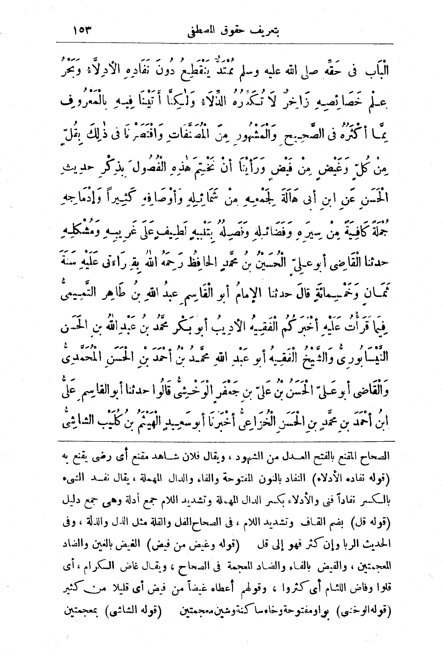 الْبَابِ فِي حَقِّهِ صَلَّى اللَّهُ عَلَيْهِ وَسَلَّمَ مُمْتَدَّ يَنْقَطِعُ دون نفاده الأدِلَّاءِ وَبَحْرُ عِلْمِ خَصَائِصِهِ زَاخِرٌ لَا تُكَدِّرُهُ الدِّلاءُ وَلَكِنَّا أَتَيْنَا فِيهِ بِالْمَعْرُوفِ مِمَّا أَكْثَرُهُ فِي الصَّحِيحِ وَالْمَشْهُورِ مِنَ الْمُصَنَّفَاتِ واقْتَصَرْنا فِي ذَلِكَ بِقُلَّ مِنْ كُلِّ وَغَيضٍ مِنْ فَيْضٍ وَرَأَيْنَا أَنْ نَخْتِمَ هَذِهِ الْفُصُولَ بِذِكْرِ حَدِيثِ الْحَسَنِ عَنِ ابْنِ أَبِي هَالَةَ لِجَمْعِهِ مِنْ شَمَائِلِهِ وَأَوْصَافِهِ كَثِيرًا وَإِدْمَاجِهِ جُمْلَةً كَافِيَةً مِنْ سِيَرِهِ وَفَضَائِلِهِ وَنَصِلُهُ بتَنِبيهٍ لَطِيفٍ عَلَى غَرِيبِهِ وَمُشْكِلِهِ حَدَّثَنَا الْقَاضِي أَبُو عَلِيٍّ الْحُسَيْنُ بْنُ مُحَمَّدٍ الْحَافِظُ رَحِمَهُ الله بقراءتي عليه سنة ثمان وخمسمائة قَالَ حَدَّثَنَا الإِمَامُ أَبُو الْقَاسِمِ عَبْدُ اللَّهِ بْنُ طَاهِرٍ التَّمِيمِيُّ فِيمَا قَرَأْتُ عَلَيْهِ أَخْبَرَكُمُ الْفَقِيهُ الْأَدِيبُ أَبُو بَكْرٍ مُحَمَّدُ بْنُ عَبْدِ اللَّهِ بْنِ الْحَسَنِ النَّيْسَابُورِيُّ وَالشَّيْخُ الْفَقِيهُ أَبُو عَبْدِ اللَّهِ مُحَمَّدُ بْنُ أَحْمَدَ بْنِ الْحَسَنِ الْمُحمَّدِيُّ وَالْقَاضِي أَبُو عَلِيٍّ الْحَسَنُ بْنُ عَلِيِّ بْنِ جَعْفَرٍ الْوَخْشِيُّ قَالُوا حَدَّثَنَا أَبُو الْقَاسِمِ على ابن أَحْمَدَ بْنِ مُحَمَّدِ بْنِ الْحَسَنِ الْخُزَاعِيُّ أَخْبَرَنَا أَبُو سَعِيدٍ الهيثم بن كليب الشاشى