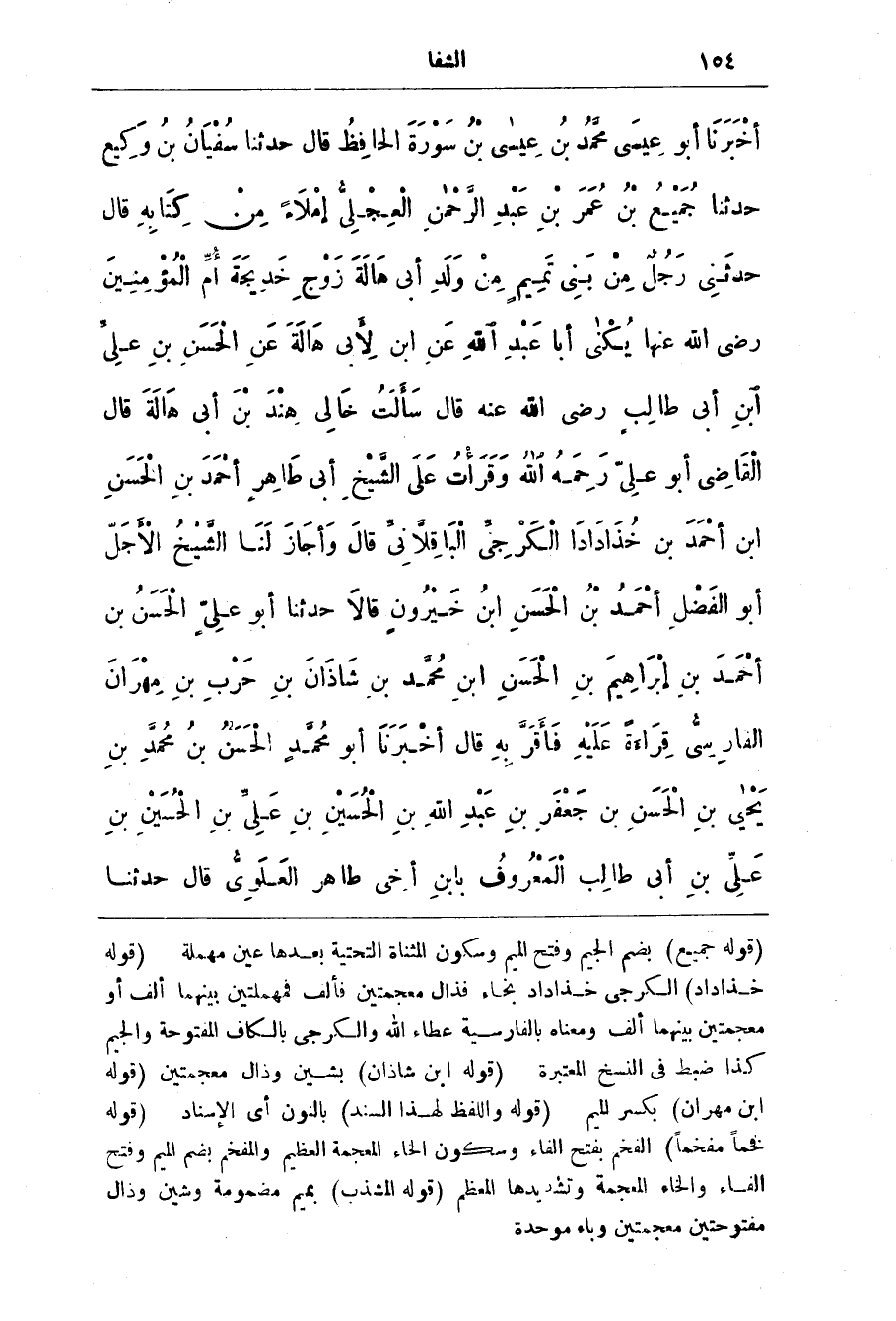 حَدَّثَنَا جُمَيْعُ بْنُ عُمَرَ بْنِ عَبْدِ الرَّحْمَنِ الْعِجْلِيُّ إِمْلَاءً مِنْ كِتَابِهِ قَالَ حَدَّثَنِي رَجُلٌ مِنْ بَنِي تَمِيمٍ مِنْ وَلَدِ أَبِي هَالَةَ زَوْجِ خَدِيجَةَ أُمِّ الْمُؤْمِنِينَ رَضِيَ اللَّهُ عَنْهَا يُكَنَّى أَبَا عَبْدِ اللَّهِ عَنِ ابْنٍ لأَبِي هَالَةَ عَنِ الحسن بن علي ابْنِ أَبِي طَالِبٍ رَضِيَ اللَّهُ عَنْهُ قَالَ سَأَلْتُ خَالِي هِنْدَ بْنَ أَبِي هَالَةَ قَالَ الْقَاضِي أَبُو عَلِيٍّ رَحِمَهُ اللَّهُ وَقَرَأْتُ عَلَى الشَّيْخِ أَبِي طَاهِرٍ أحمد بن الحسن ابن أحمد بن خذادادا الْكَرْجِيِّ الْبَاقِلَّانِيِّ قَالَ وَأَجَازَ لَنَا الشَّيْخُ الْأَجَلُّ أَبُو الفَضْلِ أحمد بن الحسن ابن خَيْرُونَ قَالَا حَدَّثَنَا أَبُو عَلِيٍّ الْحَسَنُ بْنُ أحمد بن إبْرَاهِيمَ بْنِ الْحَسَنِ ابن مُحَمَّدِ بْنِ شَاذَانَ بْنِ حَرْبِ بْنِ مِهْرَانَ الْفَارِسِيُّ قِرَاءَةً عَلَيْهِ فَأَقَرَّ بِهِ قَالَ أَخْبَرَنَا أَبُو مُحَمَّدٍ الْحَسَنُ بْنُ مُحَمَّدِ بْنِ يَحْيَى بْنِ الْحَسَنِ بْنِ جَعْفَرِ بْنِ عَبْدِ اللَّهِ بْنِ الْحُسَيْنِ بْنِ عَلِيِّ بْنِ الْحُسَيْنِ بْنِ عَلِيِّ بْنِ أَبِي طَالِبٍ الْمَعْرُوفُ بِابْنِ أَخِي طَاهِرٍ الْعَلَوِيُّ قَالَ حدثنا