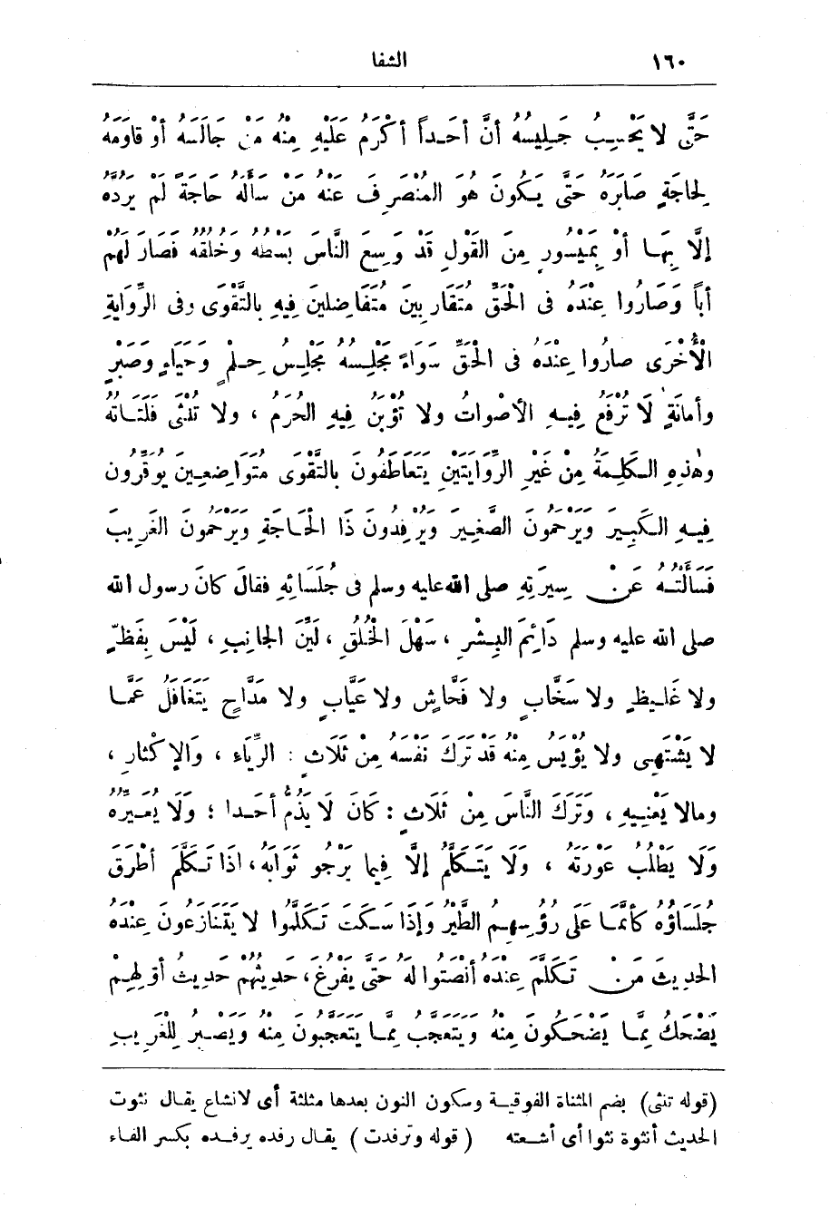 حَتَّى لَا يَحْسَبَ جَلِيسُهُ أَنَّ أَحَدًا أَكْرَمُ عَلَيْهِ مِنْهُ مَنْ جَالَسَهُ أَوْ قَاوَمَهُ لِحَاجَةٍ صَابَرَهُ حَتَّى يَكُونَ هُوَ الْمُنْصَرِفُ عَنْهُ مَنْ سَأَلَهُ حَاجَةً لَمْ يَرُدَّهُ إِلَّا بِهَا أَوْ بِمَيْسُورٍ مِنَ الْقَوْلِ قَدْ وَسِعَ النَّاسَ بَسْطُهُ وَخُلُقُهُ فَصَارَ لَهُمْ أَبًا وَصَارُوا عِنْدَهُ فِي الْحَقِّ مُتَقَارِبِينَ مُتَفَاضِلِينَ فِيهِ بِالتَّقْوَى وَفِي الرِّوَايَةِ الْأُخْرَى صَارُوا عِنْدَهُ فِي الْحَقِّ سَوَاءً مَجْلِسُهُ مَجْلِسُ حِلْمٍ وَحَيَاءٍ وَصَبْرٍ وَأَمَانَةٍ لَا تُرْفَعُ فِيهِ الْأصْوَاتُ وَلَا تُؤْبَنُ فِيهِ الْحُرَمُ، وَلَا تنشى فَلَتَاتُهُ وَهَذِهِ الْكَلِمَةُ مِنْ غَيْرِ الرِّوَايَتَيْنِ يَتَعَاطَفُونَ بِالتَّقْوَى مُتَوَاضِعِينَ يُوَقِّرُونَ فِيهِ الْكَبِيرَ وَيَرْحَمُونَ الصَّغِيرَ ويُرْفِدُونَ ذَا الْحَاجَةِ وَيَرْحَمُونَ الْغَرِيبَ فَسأَلْتُهُ عَنْ سِيرَتِهِ صَلَّى اللَّهُ عَلَيْهِ وَسَلَّمَ فِي جُلَسَائِهِ فَقَالَ كَانَ رَسُولُ اللَّهِ
