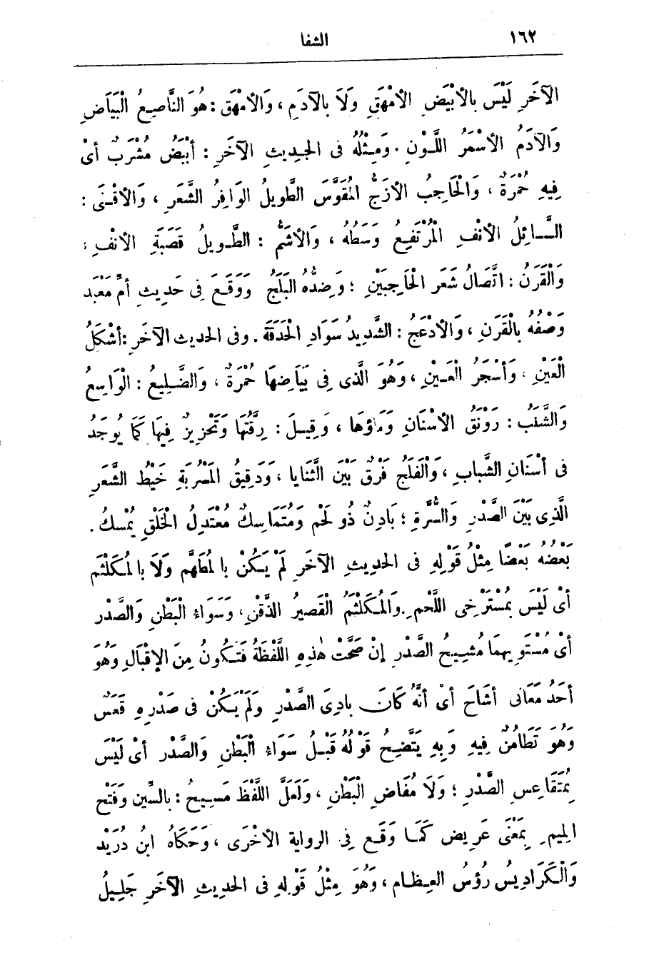 الآخَرِ لَيْسَ بِالْأَبَيْضِ الْأَمْهَقِ وَلَا بِالآدَمِ، والأَمْهَقُ: هُوَ النَّاصِعُ الْبَيَاضِ وَالآدَمُ الأَسْمَرُ اللَّوْنِ، وَمِثْلُهُ فِي الحديث الآخر: أببض مُشْرَبٌ أَيْ فِيهِ حُمْرَةٌ، وَالْحَاجِبُ الْأَزَجُّ الْمُقَوَّسُ الطَّوِيلُ الوَافِرُ الشَّعَرِ، وَالأقْنَى: السَّائِلُ الْأَنْفِ الْمُرْتَفِعُ وَسَطُهُ، وَالْأَشَمٌ: الطَّوِيلُ قَصَبَةِ الْأَنْفِ، وَالْقَرَنُ: اتِّصَالُ شَعَرِ الْحَاجِبَيْنِ، وَضِدُّهُ البَلَجُ وَوَقَعَ فِي حَدِيثِ أُمِّ مَعْبَدٍ وَصْفُهُ بِالْقَرَنِ، وَالْأَدْعَجُ: الشَّدِيدُ سَوَادِ الْحَدَقَةِ.