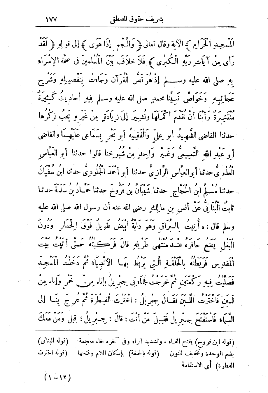 المسجد الحرام) الآية وقال تعالى (وَالنَّجْمِ إِذَا هَوَى) إِلَى قَوْلِهِ (لَقَدْ رَأَى مِنْ آيَاتِ رَبِّهِ الكبرى) فَلَا خِلافَ بَيْنَ الْمُسْلِمِينَ فِي صِحَّةِ الْإِسْرَاءِ بِهِ صَلَّى اللَّهُ عَلَيْهِ وَسَلَّمَ إِذْ هُوَ نَصُّ القرآن وجائت بِتَفْصِيلِهِ وَشَرْحِ عَجائِبِهِ وَخَوَاصِّ نَبِيِّنَا مُحَمَّدٍ صَلَّى اللَّهُ عَلَيْهِ وَسَلَّمَ فِيهِ أَحَادِيثُ كَثِيرَةٌ مُنْتَشِرَةٌ رَأَيْنَا أن نقدم أكمالها وَنُشِيرَ إِلَى زِيَادَةٍ مِنْ غَيْرِهِ يَجِبُ ذِكْرُهَا حَدَّثَنَا الْقَاضِي الشَّهِيدُ أَبُو عَلِيٍّ وَالْفَقِيهُ أَبُو بَحْرٍ بِسَمَاعِي عَلَيْهِمَا وَالْقَاضِي أَبُو عَبْدِ اللَّهِ التَّمِيمِيُّ وَغَيْرُ وَاحِدٍ مِنْ شُيُوخِنَا قَالُوا حَدَّثَنَا أَبُو الْعَبَّاسِ الْعُذْرِيُّ حَدَّثَنَا أَبُو الْعَبَّاسِ الرَّازِيُّ حَدَّثَنَا أَبُو أَحْمَدَ الْجُلُودِيُّ حَدَّثَنَا ابْنُ سُفْيَانَ حدثنا مسلم ابن الْحَجَّاجِ حَدَّثَنَا شَيْبَانُ بْنُ فَرُّوخَ حَدَّثَنَا حَمَّادُ بْنُ سَلَمَةَ حَدَّثَنَا