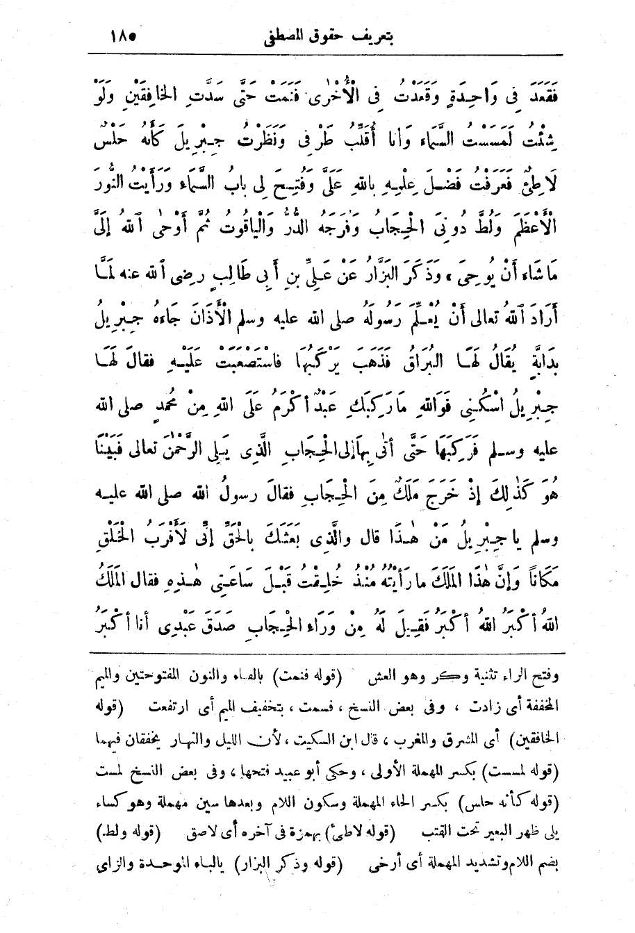 فَقَعَدَ فِي وَاحِدَةٍ وَقَعَدْتُ فِي الْأُخْرَى فَنِمْتُ حَتَّى سَدَّتِ الْخَافِقَيْنِ وَلَوْ شْئِتُ لَمَسِسْتُ السَّمَاءَ وَأَنَا أُقَلِّبُ طَرْفِي وَنَظَرْتُ جِبْرِيلَ كَأَنَّهُ حَلْسٌ لاطِئٌ فَعَرَفْتُ فَضْلَ عِلْمِهِ بِاللَّهِ عَلَيَّ وَفُتِحَ لِي بَابُ السَّمَاءِ وَرَأَيْتُ النُّورَ الْأَعْظَمَ وَلَطَّ دُونِيَ الْحِجَابُ وَفَرَجَهُ الدُّرُّ وَالْيَاقُوتُ ثُمَّ أَوْحَى اللَّهُ إِلَيَّ مَا شَاءَ أَنْ يُوحِيَ) وَذَكَرَ الْبَزَّارُ عَنْ عَلِيٍّ بن أبي طالب رضي الله عَنْهُ لَمَّا أَرَادَ اللَّهُ تَعَالَى أَنْ يُعَلِّمَ رَسُولَهُ صَلَّى اللَّهُ عَلَيْهِ وَسَلَّمَ الْأَذَانَ جَاءَهُ جِبْرِيلُ بِدَابَّةٍ يُقَالُ لَهَا الْبُرَاقُ فَذَهَبَ يَرْكَبُهَا فَاسْتَصْعَبَتْ عَلَيْهِ فَقَالَ لَهَا جبريل اسكني فو الله مَا رَكِبَكِ عَبْدٌ أَكْرَمُ عَلَى اللَّهِ مِنْ مُحَمَّدٍ صَلَّى اللَّهُ عَلَيْهِ وَسَلَّمَ فَرَكِبَهَا حَتَّى أَتَى بِهَا إِلَى الْحِجَابِ الَّذِي يَلِي الرَّحْمَنِ تَعَالَى فَبَيْنَا هُوَ كَذَلِكَ إِذْ خَرَجَ مَلَكٌ مِنَ الْحِجَابِ فَقَالَ رَسُولُ اللَّهِ صَلَّى اللَّهُ عَلَيْهِ وَسَلَّمَ يَا جِبْرِيلُ مَنْ هَذَا قَالَ وَالَّذِي بَعَثَكَ بِالْحَقِّ إِنِّي لأَقْرَبُ الْخَلْقِ مَكَانًا وَإِنَّ هَذَا الْمَلَكَ مَا رَأَيْتُهُ مُنْذُ خُلِقْتُ قَبْلَ سَاعَتِي هَذِهِ فَقَالَ الْمَلَكُ اللَّهُ أَكْبَرُ اللَّهُ أَكْبَرُ فَقِيلَ لَهُ مِنْ وَرَاءِ الْحِجَابِ صَدَقَ عَبْدِي أنا أكبر
