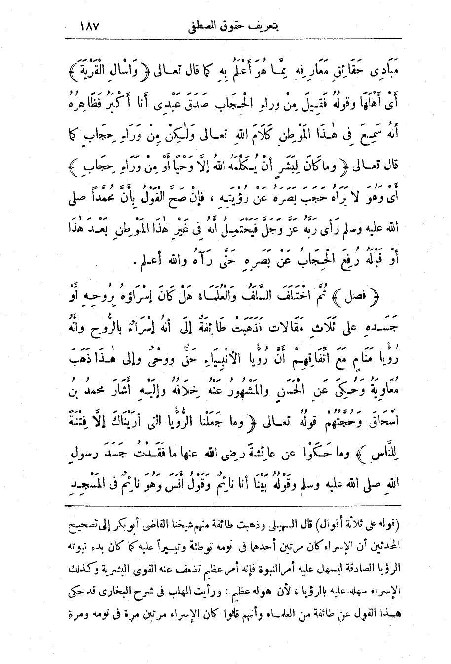 مبادى حَقَائِقِ مَعَارِفِهِ مِمَّا هُوَ أَعْلَمُ بِهِ كَمَا قال تعالى (واسال القرية) أَيْ أَهْلَهَا وَقَوْلُهُ فَقِيلَ مِنْ وَرَاءِ الْحِجَابِ صَدَقَ عَبْدِي أَنَا أَكْبَرُ فَظَاهِرُهُ أَنَّهُ سَمِعَ فِي هَذَا الْمَوْطِنِ كَلامَ اللَّهِ تَعَالَى وَلَكِنْ مِنْ وَرَاءِ حِجَابٍ كَمَا قَالَ تَعَالَى (وَمَا كَانَ لِبَشَرٍ أَنْ يُكَلِّمَهُ اللَّهُ إِلا وَحْيًا أَوْ مِنْ وَرَاءِ حِجَابٍ) أَيْ وَهُوَ لَا يَرَاهُ حَجَبَ بَصَرَهُ عَنْ رُؤْيَتِهِ، فَإِنْ صَحَّ الْقَوْلُ بِأَنَّ مُحَمَّدًا صَلَّى اللَّهُ عَلَيْهِ وَسَلَّمَ رَأَى رَبَّهُ عَزَّ وَجَلَّ فَيَحْتَمِلُ أَنَّهُ فِي غَيْرِ هَذَا الْمَوْطِنِ بَعْدَ هَذَا أَوْ قَبْلَهُ رُفِعَ الْحِجَابُ عَنْ بَصَرِهِ حَتَّى رَآهُ وَاللَّهُ أَعْلَمُ.