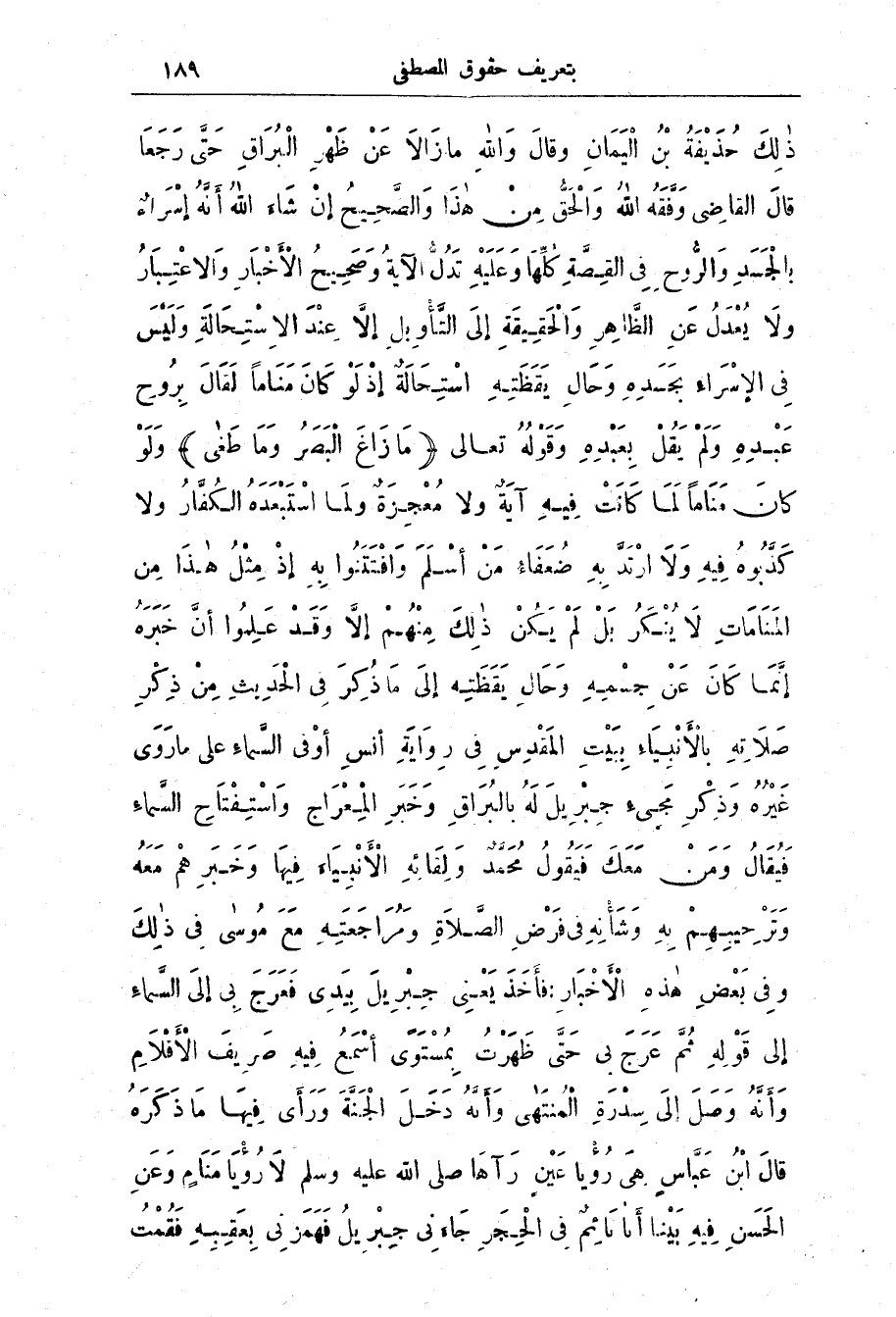 ذَلِكَ حُذَيْفَةُ بْنُ الْيَمَانِ وَقَالَ وَاللَّهِ مَا زَالَا عَنْ ظَهْرِ الْبُرَاقِ حَتَّى رَجَعَا قَالَ الْقَاضِي وَفَّقَهُ اللَّهُ وَالْحَقُّ مِنْ هَذَا وَالصَّحِيحُ إِنْ شَاءَ اللَّهُ أَنَّهُ إِسْرَاءٌ بِالْجَسَدِ وَالرُّوحِ فِي الْقِصَّةِ كُلِّهَا وَعَلَيْهِ تَدُلٌّ الآيَةُ وَصَحِيحُ الْأَخْبَارِ وَالاعْتِبَارُ وَلَا يُعْدَلُ عَنِ الظَّاهِرِ وَالْحَقِيقَةِ إِلَى التَّأْوِيلِ إِلَّا عِنْدَ الاسْتِحَالَةِ وَلَيْسَ فِي الْإِسْرَاءِ بِجَسَدِهِ وَحَالِ يَقْظَتِهِ اسْتِحَالَةٌ إِذْ لَوْ كَانَ مَنَامًا لَقَالَ بِرُوحِ عَبْدِهِ وَلَمْ يَقُلْ بِعَبْدِهِ وَقَوْلُهُ تَعَالَى (مَا زَاغَ الْبَصَرُ وَمَا طغى) وَلَوْ كَانَ مَنَامًا لَمَا كَانَتْ فِيهِ آيَةٌ وَلَا مُعْجِزَةٌ وَلَمَا اسْتَبْعَدَهُ الْكُفَّارُ وَلَا كَذَّبُوهُ فِيهِ وَلَا ارتد به ضعفاء من أسلم وافتتنوا به إذ مثل هذا من المنامات لا ينكر بل لم يكن ذلك منهم إلا وقد عَلِمُوا أَنَّ خَبَرَهُ إِنَّمَا كَانَ عَنْ جِسْمِهِ وَحَالِ يَقْظَتِهِ إِلَى مَا ذُكِرَ فِي الْحَدِيثِ مِنْ ذِكْرِ صَلاتِهِ بِالْأَنْبِيَاءِ بِبَيْتِ الْمَقْدِسِ فِي رِوَايَةِ أَنَسٍ أَوْ فِي السَّمَاءِ عَلَى مَا رَوَى غَيْرُهُ وذكر مجئ جِبْرِيلَ لَهُ بِالبُرَاقِ وَخَبَرِ الْمِعْرَاجِ وَاسْتِفْتَاحِ السَّمَاءِ فَيُقَالُ وَمَنْ مَعَكَ فَيَقُولُ مُحَمَّدٌ وَلِقَائِهِ الْأَنْبِيَاءَ فِيهَا وَخَبَرِهِمْ مَعَهُ وَتَرْحِيبِهِمْ بِهِ وَشأْنِهِ فِي فَرْضِ الصَّلَاةِ وَمُراجَعَتِهِ مَعَ مُوسَى فِي ذَلِكَ وَفِي بَعْضِ هَذِهِ الْأَخْبَارِ: فَأَخَذَ يَعْنِي جِبْرِيلَ بِيَدِي فَعَرَجَ بِي إِلَى السَّمَاءِ إِلَى قَوْلِهِ ثم عرج بي حتى ظهرت بمستوى أَسْمَعُ فِيهِ صَرِيفَ الْأَقْلامِ وَأَنَّهُ وَصَلَ إِلَى سِدْرَةِ المنتهى وَأَنَّهُ دَخَلَ الْجَنَّةَ ورأى فيها ما ذِكْرَهُ قَالَ ابْنُ عَبَّاسٍ هِيَ رُؤْيَا عَيْنٍ رَآهَا صَلَّى اللَّهُ عَلَيْهِ وَسَلَّمَ لَا رُؤْيَا مَنَامٍ وَعَنِ الْحَسَنِ فِيهِ بَيْنَا أَنَا نَائِمٌ فِي الْحِجْرِ جَاءَنِي جِبْرِيلُ فَهَمَزَنِي بِعَقِبِهِ فَقُمْتُ
