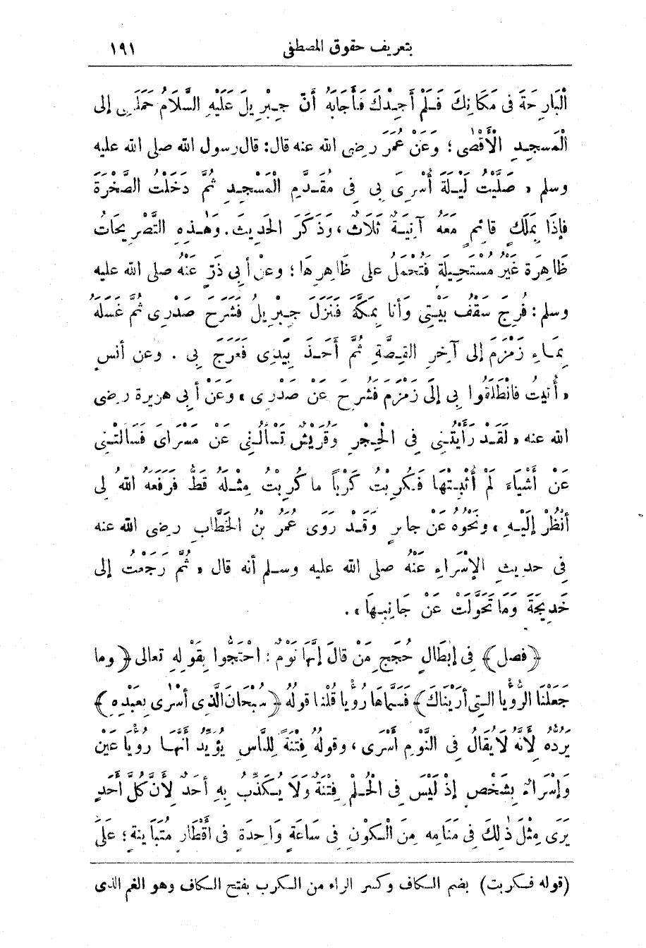 (فصل) فِي إِبْطَالِ حُجَجِ مِنْ قَالَ إِنَّهَا نَوْمٌ احْتَجُّوا بِقَوْلِهِ تَعَالَى (وَمَا جَعَلْنَا الرُّؤْيَا التى أريناك) فَسَمَّاهَا رُؤْيَا قُلْنَا قَوْلُهُ (سُبْحَانَ الَّذِي أَسْرَى بعبده) يَرُدُّهُ لِأَنَّهُ لَا يُقَالُ فِي النَّوْمِ أَسْرَى، وَقَوْلُهُ فِتْنَةٌ لِلنَّاسِ يُؤَيِّدُ أَنَّهَا رُؤْيَا عَيْنٍ وَإِسْرَاءٌ بِشَخْصٍ إِذْ لَيْسَ فِي الْحُلْمِ فِتْنَةٌ وَلَا يُكَذِّبُ بِهِ أَحَدٌ لِأَنَّ كُلَّ أَحَدٍ يَرَى مِثْلَ ذَلِكَ فِي مَنَامِهِ مِنَ الْكَوْنِ فِي سَاعَةٍ وَاحِدَةٍ فِي أَقْطَارٍ مُتَبَايِنَةٍ، عَلَى