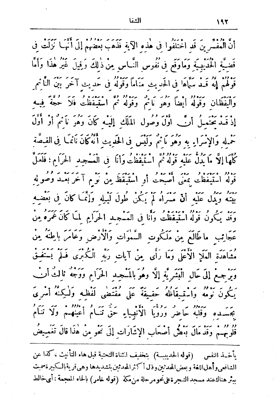 قَوْلُهُمْ إِنَّهُ قَدْ سَمَّاهَا فِي الْحَدِيثَ مَنَامًا وَقَوْلُهُ فِي حَدِيثٍ آخَرَ بَيْنَ النَّائِمِ وَالْيَقْظَانِ وَقَوْلُهُ أَيْضًا وَهُوَ نَائِمٌ وَقَوْلُهُ ثُمَّ اسْتَيْقَظْتُ فَلَا حُجَّةَ فِيهِ إِذْ قَدْ يَحتَمِلُ أَنَّ أول وُصُولَ الْمَلَكِ إِلَيْهِ كَانَ وَهُوَ نَائِمٌ أَوْ أَوَّلَ حَمْلِهِ وَالْإِسْرَاءِ بِهِ وَهُوَ نَائِمٌ وَلَيْسَ فِي الْحَدِيثَ أَنَّهُ كَانَ نَائِمًا فِي الْقِصَّةِ كُلِّهَا إِلَّا مَا يَدُلُّ عَلَيْهِ قَوْلُهُ ثُمَّ اسْتَيْقَظْتُ وَأَنَا فِي الْمَسْجِدِ الْحَرَامِ، فَلَعَلَّ قَوْلَهُ اسْتَيْقَظْتُ بِمَعْنَى أصْبَحْتُ أَوِ اسْتَيْقَظَ مِنْ نَوْمٍ آخَرَ بَعْدَ وُصُولِهِ بَيْتَهُ وَيَدُلُّ عَلَيْهِ أَنَّ مَسْرَاهُ لَمْ يَكُنْ طُولَ لَيْلِهِ وَإِنَّمَا كَانَ فِي بَعْضِهِ وَقَدْ يَكُونُ قَوْلُهُ اسْتَيْقَظْتُ وَأَنَا فِي الْمَسْجِدِ الْحَرَامِ لِمَا كَانَ غَمَرَهُ مِنْ عَجَائِبِ مَا طالع من مَلَكُوت السَّمَوَات وَالْأَرْضِ وَخَامَرَ بَاطِنَهُ مِنْ مُشَاهَدَةِ الْمَلِأ الْأَعْلَى وَمَا رَأَى مِنْ آيَاتِ رَبَّهُ الْكُبْرَى فَلَمْ يَسْتَفِقْ وَيَرْجِعْ إلى حَالِ الْبَشَرِيَّةِ إِلَّا وَهُوَ بِالْمَسْجِدِ الْحَرَامِ وَوَجْهٌ ثَالِثٌ أَنْ يَكُونَ نَوْمُهُ وَاسْتِيقَاظُهُ حَقِيقَةً عَلَى مُقْتَضَى لَفْظِهِ وَلَكِنَّهُ أُسْرِيَ بِجَسَدِهِ وَقَلْبُهُ حَاضِرٌ وَرُؤْيَا الْأَنْبِيَاءِ حَقٌّ تَنَامُ أَعْيُنُهُمْ وَلَا تَنَامُ قُلُوبُهُمْ وَقَدْ مَالَ بَعْضُ أَصْحَابِ الإشَارَاتِ إِلَى نَحْوٍ مِنْ هَذَا قَالَ تَغْمِيضُ