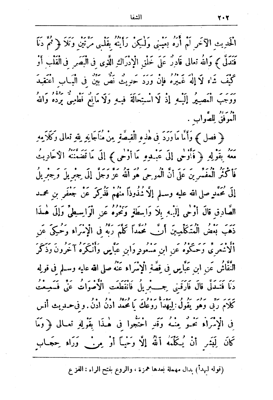 (فصل) وَأَمَّا مَا وَرَدَ فِي هَذِهِ الْقِصَّةِ مِنْ مُنَاجَاتِهِ لله تعالى وكلامه معه بِقَوْلِهِ (فَأَوْحَى إِلَى عَبْدِهِ مَا أوحى) إِلَى مَا تَضَمَّنَتْهُ الْأَحَادِيثُ فَأَكْثَرُ الْمُفَسّرِينَ عَلَى أَنَّ الْمُوحِيَ هُوَ اللَّه عَزَّ وَجَلَّ إِلَى جِبْرِيلَ وجِبْرِيلُ إِلَى مُحَمَّدٍ صَلَّى اللَّهُ عَلَيْهِ وَسَلَّمَ إلَّا شُذُوذًا مِنْهُمْ فَذُكِرَ عَنْ جَعْفَرِ بْنِ مُحَمَّدٍ الصَّادِقِ قَالَ أَوْحَى إليْهِ بلا وَاسِطَةٍ وَنَحْوَهُ عَنِ الْوَاسِطِيّ وَإِلَى هَذَا ذَهَبَ بَعْضُ الْمُتَكَلّمِينَ أَنَّ مُحَمَّدًا كَلَّمَ رَبَّهُ فِي الْإِسْرَاءِ وَحُكِيَ عَنِ الْأَشْعَرِيِّ وَحَكَوْهُ عَنِ ابْنِ مَسْعُودٍ وَابْنِ عَبَّاس وَأَنْكَرَهُ آخَرُونَ وَذَكَرَ النَّقَّاشُ عَنِ ابْنِ عَبَّاس فِي قِصَّةِ الْإِسْرَاءِ عَنْهُ صَلَّى اللَّهُ عَلَيْهِ وَسَلَّمَ فِي قَوْلِهِ دَنَا فَتَدَلَّى قَالَ فَارَقَنِي جِبْرِيلُ فَانْقَطَعَتِ الْأَصْواتُ عَنّي فَسَمِعْتُ كَلَامَ رَبّي وَهُوَ يَقُولُ: لِيَهْدَأْ رَوْعُكَ يَا مُحَمَّدُ ادْنُ ادْنُ.