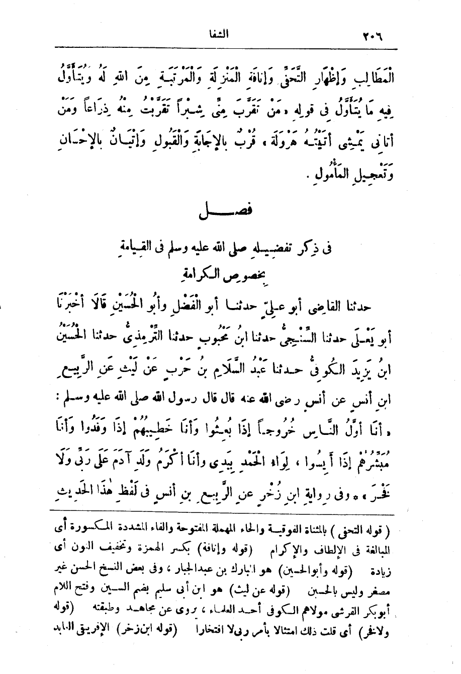 (فصل) فِي ذِكر تفضيله صَلَّى اللَّهُ عَلَيْهِ وَسَلَّمَ فِي القيامة بخصوص الكرامة حَدَّثَنَا الْقَاضِي أَبُو عَلِيٍّ حَدَّثَنَا أَبُو الْفَضْلِ وَأَبُو الْحُسَيْنِ قَالَا أَخْبَرَنَا أَبُو يَعْلَى حَدَّثَنَا السِّنْجِيُّ حَدَّثَنَا ابْنُ مَحْبُوبٍ حَدَّثَنَا التِّرْمِذِيُّ حدثنا الحسين ابن يَزِيدَ الْكُوفِيُّ حَدَّثَنَا عَبْدُ السَّلامِ بْنُ حَرْبٍ عَنْ لَيْثٍ عن الربيع ابن أنس عن أنس رضي الله عنه قال قال رسول اللَّهِ صَلَّى اللَّهُ عَلَيْهِ وَسَلَّمَ: (أَنَا أَوَّلُ النَّاسِ خُرُوجًا إِذَا بُعِثُوا وَأَنَا خَطِيبُهُمْ إِذَا وَفَدُوا وَأَنَا مُبَشِّرُهُمْ إِذَا أَيِسُوا، لِوَاءُ الْحَمْدِ بِيَدِي وأنا أكرم ولد آدم على ربي وَلَا فَخْرَ) * وَفِي رِوَايَةِ ابْن زُخْرٍ عَنِ الرَّبِيعِ بْن أَنَسٍ فِي لَفْظِ هَذَا الْحَدِيث