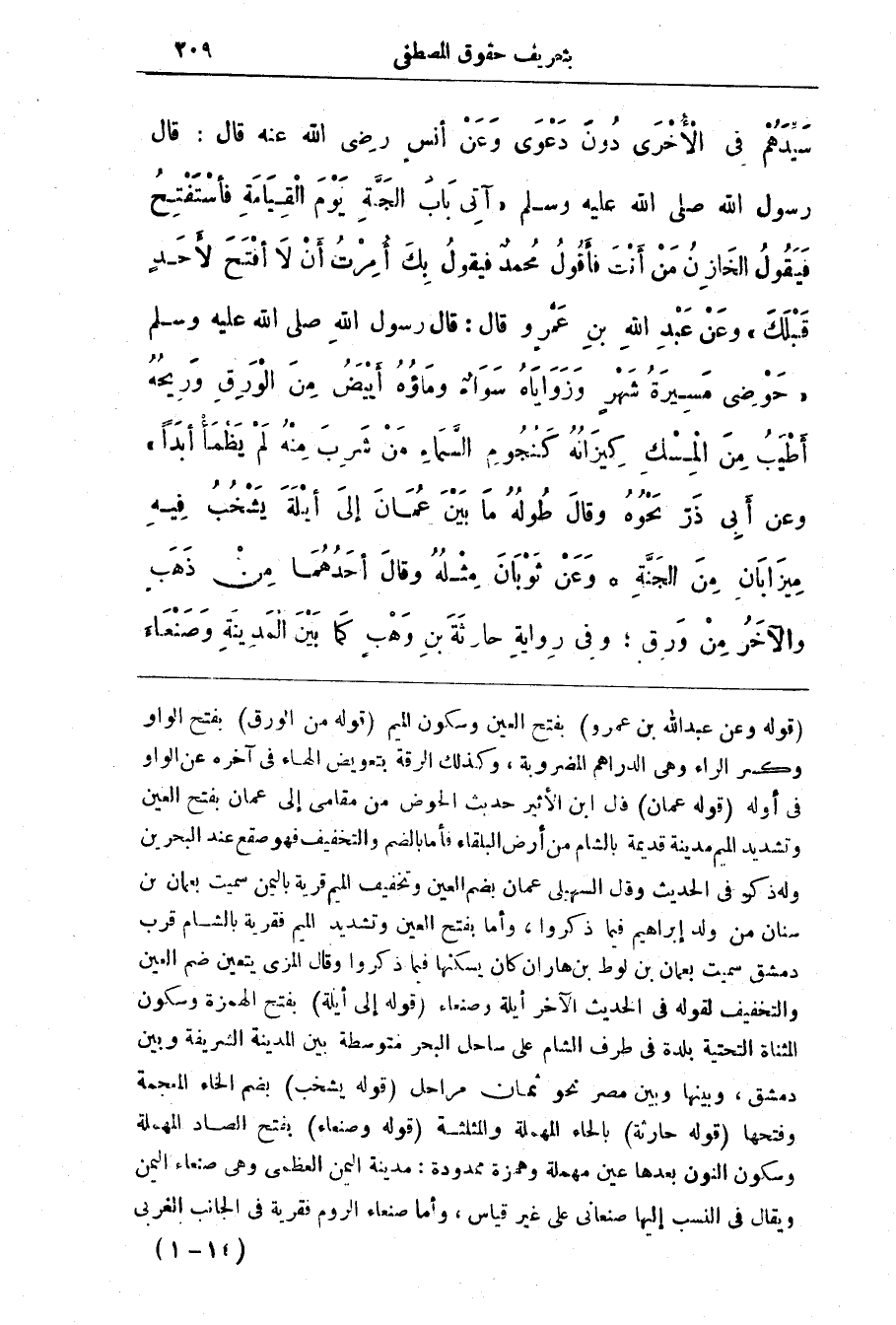 وتشديد الميم مدينة قديمة بالشام من أرض البلقاء فأما بالضم والتخفيف فهو صقع عند البحرين وله ذكر في الحديث وقال السهيلي عمان بضم العين وتخفيف الميم قرية باليمن سميت بعمان بن سنان مِنْ وَلَدِ إِبْرَاهِيمَ فيما ذكروا، وأما بفتح العين وتشديد الميم فقرية بالشام قرب دمشق سميت بعمان بن لوط بن هاران كان يسكنها فيما ذكروا وقال المزى يتعين ضم العين والتخفيف لقوله في الحديث الآخر أيلة وصنعاء (قوله إلى أيلة) بفتح الهمزة وسكون المثناة التحتية بلدة في طرف الشام على ساحل البحر متوسطة بين المدينة الشريفة وبين دمشق، وبينها وبين مصر نحو ثمان مراحل (قوله يشخب) بضم الخاء المعجمة وفتحها (قوله حارثة) بالحاء المهملة والمثلثة (قوله وصنعاء) بفتح الصاد المهملة وسكون النون بعدها عين مهملة وهمزة ممدودة: مدينة اليمن العظمى وهى صنعاء اليمن ويقال في النسب إليها صنعاني على غير قياس، وأما صنعاء الروم فقرية في الجانب الغربي من دمشق في ناحية الروم (14 - 1) (*)