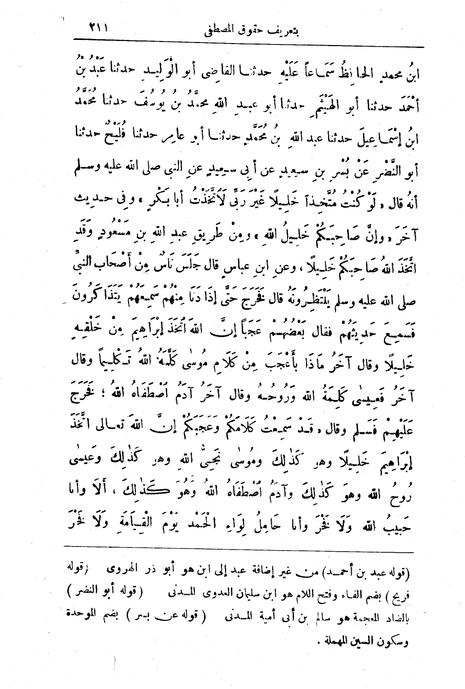 ابن مُحَمَّدٍ الْحَافِظُ سَمَاعًا عَلَيْهِ حَدَّثَنَا الْقَاضِي أَبُو الْوَلِيدِ حَدَّثَنَا عَبْدُ بْنُ أَحْمَدَ حَدَّثَنَا أَبُو الْهَيْثَمِ حَدَّثَنَا أَبُو عَبْدِ اللَّهِ مُحَمَّدُ بْنُ يوسف حدثنا محمد ابْنُ إِسْمَاعِيلُ حَدَّثَنَا عَبْدُ اللَّهِ بْنُ مُحَمَّدٍ حَدَّثَنَا أَبُو عَامِرٍ حَدَّثَنَا فُلَيْحٌ حَدَّثَنَا أَبُو النَّضْرِ عَنْ بُسْرِ بْنِ سَعِيدٍ عَنْ أَبِي سَعِيدٍ عَنِ النَّبِيِّ صلى الله عليه وسلم أنه قَالَ (لَوْ كُنْتُ مُتَّخِذًا خَلِيلًا غَيْر رَبِّي لاتَّخَذْتُ أَبَا بَكْرٍ) وَفِي حَدِيثٍ آخَرَ (وإنَّ صَاحِبَكُمْ خَلِيلُ اللَّهِ) وَمِنْ طَرِيقِ عَبْدِ اللَّهِ بن مسعود وفد اتَّخَذَ اللَّهَ صَاحَبُكُمْ خَلِيلا، وَعَنِ ابْنِ عَبَّاسٍ قَالَ جَلَسَ نَاسٌ مِنْ أَصْحَابِ النَّبِيِّ صَلَّى اللَّهُ عَلَيْهِ وَسَلَّمَ يَنْتَظِرُونَهُ قَالَ فَخَرَجَ حَتَّى إذَا دَنَا مِنْهُمْ سَمِعَهُمْ يَتَذَاكَرُونَ فَسَمِعَ حَدِيثَهُمْ فَقَالَ بَعْضُهُمْ عَجَبًا إنَّ اللَّه اتَّخَذَ إبْرَاهِيمَ من خَلْقِهِ