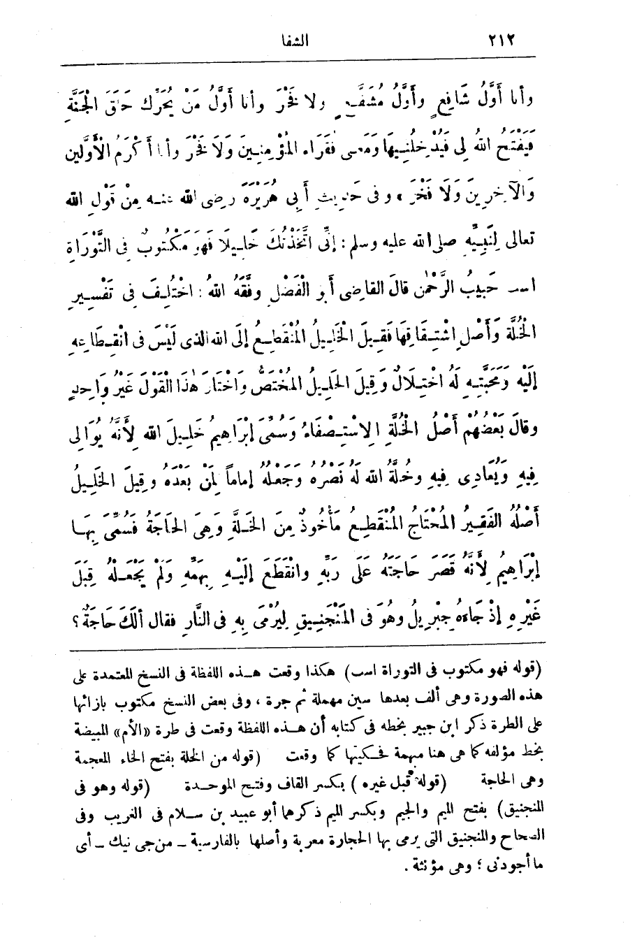 وَأَنَا أَوَّلُ شَافِعٍ وأول مشفع ولا فَخْرَ وَأَنَا أَوَّلُ من يُحَرّكُ حَلَقَ الْجنةِ فَيَفْتَحُ اللَّه لى فيد خلنيها وَمَعِي فُقَرَاءُ الْمُؤْمِنينَ وَلَا فَخْرَ وَأَنَا أَكْرَمُ الأولين والآخرين ولا فخر) فِي حَدِيث أَبِي هُرَيْرَةَ رَضِيَ اللَّه عَنْهُ من قَوْلِ اللَّه تَعَالَى لِنَبِيّهِ صَلَّى اللَّهُ عَلَيْهِ وَسَلَّمَ: إِنّيِ اتَّخَذْتُكَ خَلِيلًا فَهُوَ مَكْتُوبٌ في التوراة اس حَبِيبُ الرَّحْمنِ قَالَ الْقَاضِي أَبُو الْفَضْلِ وَفَّقَهُ اللَّه: اخْتُلِفَ فِي تَفْسِيرِ الْخُلَّةِ وَأصْلِ اشْتِقَاقِهَا فَقِيلَ الْخَلِيلُ الْمُنْقَطِعُ إِلَى اللَّه الَّذِي لَيْسَ فِي انْقِطَاعِهِ إليه وَمَحَبَّتِهِ لَهُ اخْتِلَالٌ وَقِيلَ الْخَلِيلُ الْمُخْتَصُّ وَاخْتَارَ هَذَا الْقَوْلَ غَيْرُ وَاحدٍ وَقَالَ بَعْضُهُمْ أَصْلُ الْخُلَّةِ الاسْتِصْفَاءُ وَسُمّيَ إبْرَاهِيمُ خليل اللَّه لِأَنَّهُ يُوَالِي فِيهِ ويُعَادِي فِيهِ وَخُلَّةُ اللَّه لَهُ نَصْرُه وَجَعْلُهُ إمَامًا لِمَنْ بَعْدَهُ وَقِيلَ الْخَلِيلُ أَصْلُهُ الْفَقِيرُ الْمُحْتَاجُ الْمُنْقَطِعُ مَأْخُوذٌ مِنَ الْخَلَّةِ وَهِيَ الْحَاجَةُ فَسُمّي بِهَا إبْرَاهِيمُ لِأَنَّهُ قَصَر حَاجَتَهُ عَلَى رَبَّهُ وَانْقَطَعَ إِليْهِ بهمه ولم يهمه وَلَمْ يَجْعَلْهُ قَبْلَ