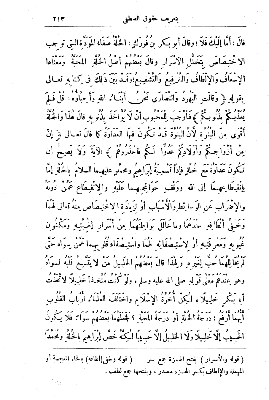 قَالَ: أَمَّا إِلَيْكَ فَلَا، وَقَالَ أَبُو بَكْرٍ بن فُوركٍ: الْخُلَّةُ صَفَاءُ الْمَوَدَّةِ التي تُوجِبُ الاخْتِصَاصَ بِتَخَلُّلِ الْأَسْرَارِ وَقَالَ بَعْضُهُمْ أَصْلُ الْخُلَّةِ الْمَحَبَّةُ وَمَعْنَاهَا الْإِسْعَافُ وَالْإِلْطَافُ والتَّرْفِيعُ والتَّشْفِيعُ، وَقَدْ بَيَّنَ ذَلِكَ فِي كِتَابِهِ تَعَالَى بِقَوْلِهِ (وَقَالَتِ الْيَهُودُ وَالنَّصَارَى نَحْنُ أَبْنَاءُ اللَّهِ وَأَحِبَّاؤُهُ، قُلْ فَلِمَ يُعَذِّبُكُمْ بِذُنُوبِكُمْ) فَأَوْجَبَ لِلْمَحْبُوبِ أنْ لا يُؤَاخَذَ بِذُنُوبِهِ قَالَ هَذَا وَالْخُلَّةُ أقْوَى مِنَ البُنُوَّةِ لِأَنَّ البُنُوَّة قَدْ تَكُونُ فِيهَا الْعَدَاوَةُ كَمَا قَالَ تَعَالَى (إِنَّ مِنْ أَزْوَاجِكُمْ وَأَوْلادِكُمْ عَدُوًّا لَكُمْ فَاحْذَرُوهُمْ) الآيَةَ وَلَا يَصِحُّ أَن تَكُونَ عَدَاوَةٌ مَعَ خُلَّةٍ فَإِذَا تَسْمِيَةُ إبْرَاهِيم وِمُحَمَّدٍ عَلَيْهَمَا السَّلَامُ بِالْخُلَّةِ إِمَّا بِانْقِطَاعِهِمَا إِلَى اللَّه وَوَقْفِ حَوَائِجِهِمَا عَلَيْهِ وَالانْقِطَاعِ عَمَّنْ دُونَهُ وَالْإضْرَابِ عَنِ الْوَسَائِطِ وَالْأسْبَابِ أَوْ لِزيَادَةِ الاخْتِصَاصِ مِنْهُ تَعَالَى لَهُمَا وَخَفَيّ إلطَافِهِ عِنْدَهُمَا وَمَا خَالَلَ بَوَاطِنهمَا من أسرار إلهيته وَمَكْنُونِ غُيُوبِهِ وَمَعْرِفَتِهِ أَوْ لاسْتِصْفَائِهِ لَهُمَا وَاسْتِصْفَاءِ قُلُوبِهِمَا عَمَّنْ سِواهُ حَتَّى