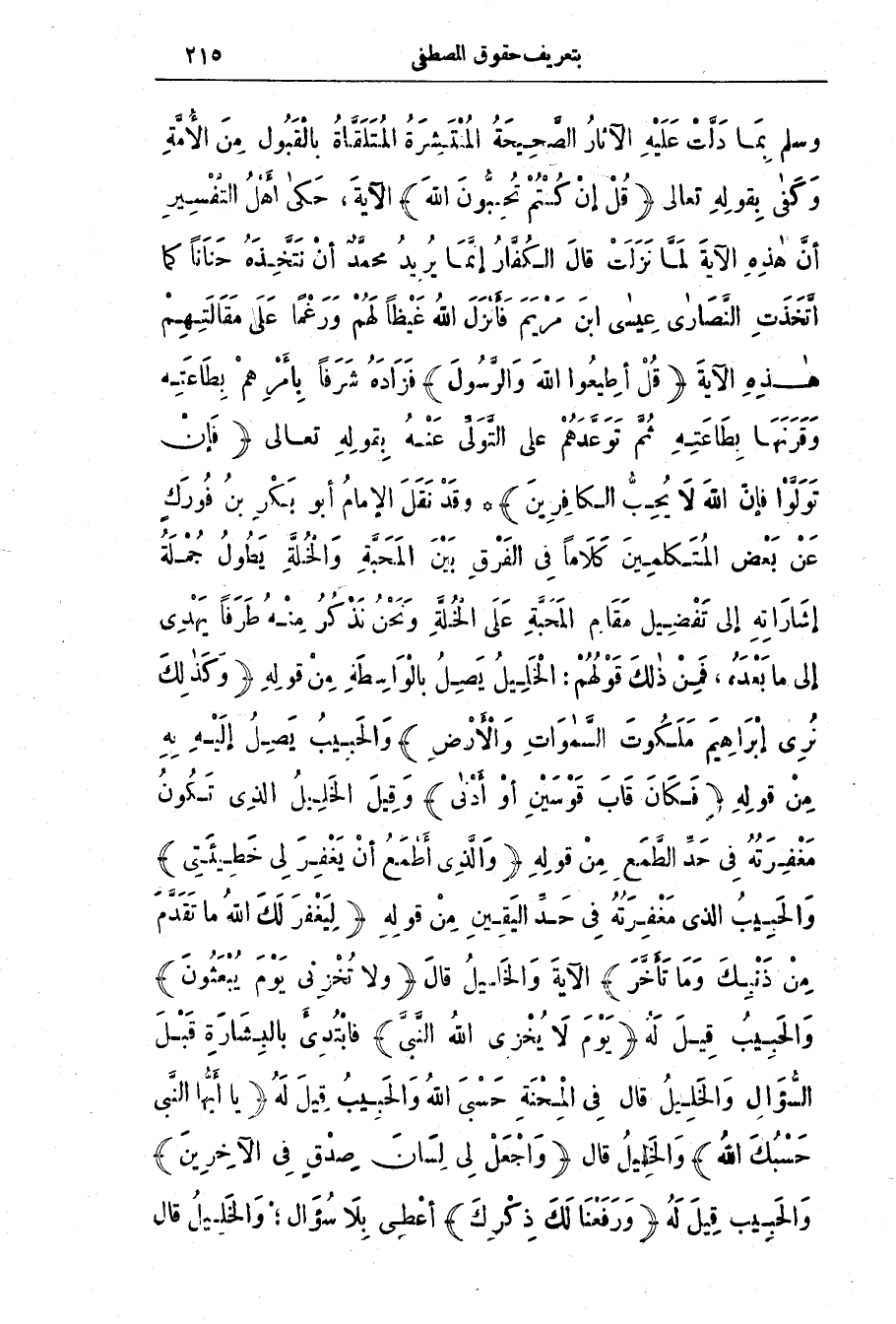 وَسَلَّمَ بِمَا دَلَّتْ عَلَيْهِ الآثَارُ الصَّحِيحَة المنتشرة الْمُتَلَقَّاةُ بِالْقَبُولِ مِنَ الْأُمَّةِ وَكَفَى بِقَوْلِهِ تَعَالَى (قُلْ إِنْ كُنْتُمْ تُحِبُّونَ اللَّهَ) الآيَةَ، حكى أَهْلُ التَّفْسِيرِ أَنَّ هَذِهِ الآيَةَ لَمّا نَزَلَتْ قَالَ الْكُفَّارُ إنَّمَا يُرِيدُ مُحَمَّدٌ أنْ نتخذه حنانا كما اتخذت النصارى عيسى ابن مَرْيَمَ فَأَنْزَلَ اللَّهُ غَيْظًا لَهُمْ وَرَغْمًا عَلَى مَقَالَتِهِمْ هَذِهِ الآيَةَ (قُلْ أَطِيعُوا اللَّهَ وَالرَّسُولَ) فَزَادَهُ شَرَفًا بِأَمْرِهِمِ بِطَاعَتِهِ وَقَرَنَها بِطَاعَتِهِ ثُمَّ تَوَعَّدَهُمْ عَلَى التوَلّي عَنْهُ بِقَوْلِهِ تَعَالَى (فَإِنْ تَوَلَّوْا فَإِنَّ اللَّهَ لا يحب الكافرين) * وَقَدْ نَقَلَ الْإِمَام أَبُو بَكْرِ بن فُورَك عَنْ بَعْض الْمُتَكَلّمِينَ كَلامًا فِي الْفَرْقِ بَيْنَ الْمَحَبَّةَ وَالْخُلَّةِ يَطُولُ جُمْلَةُ إشاراته إِلَى تَفْضِيلِ مَقَامِ الْمَحَبَّةَ عَلَى الْخُلَّةِ وَنَحْنُ نَذْكُرُ مِنْهُ طَرَفًا يَهْدِي إِلَى مَا بَعْدَهُ، فَمْن ذَلِكَ قَوْلهُمُ: الْخَلِيلُ يَصِلُ بِالْوَاسِطَةِ من قَوْلِهِ (وَكَذَلِكَ نُرِي إِبْرَاهِيمَ مَلَكُوتَ السَّمَوَاتِ وَالأَرْضِ) وَالْحَبِيبُ يَصِلُ إليْهِ بِهِ من قَوْلِهِ (فَكَانَ قَابَ قَوْسَيْنِ أو أدنى) وَقِيلَ الْخَلِيلُ الَّذِي تَكُونُ مَغْفِرَتُهُ فِي حَدّ الطَّمَع من قَوْلِهِ (وَالَّذِي أَطْمَعُ أَنْ يَغْفِرَ لِي خطيئتي وَالْحَبِيبُ الَّذِي مَغْفِرَتُهُ فِي حَد اليَقِينِ من قَوْلِهِ (لِيَغْفِرَ لَكَ اللَّهُ مَا تَقَدَّمَ مِنْ ذَنْبِكَ وما تأخر) الآيَةَ وَالْخَلِيلُ قَالَ (وَلا تُخْزِنِي يَوْمَ يُبْعَثُونَ) وَالْحَبِيبُ قِيلَ لَهُ (يَوْمَ لا يُخْزِي اللَّهُ النبي) فابتديئ بِالبِشَارَةِ قَبْلَ