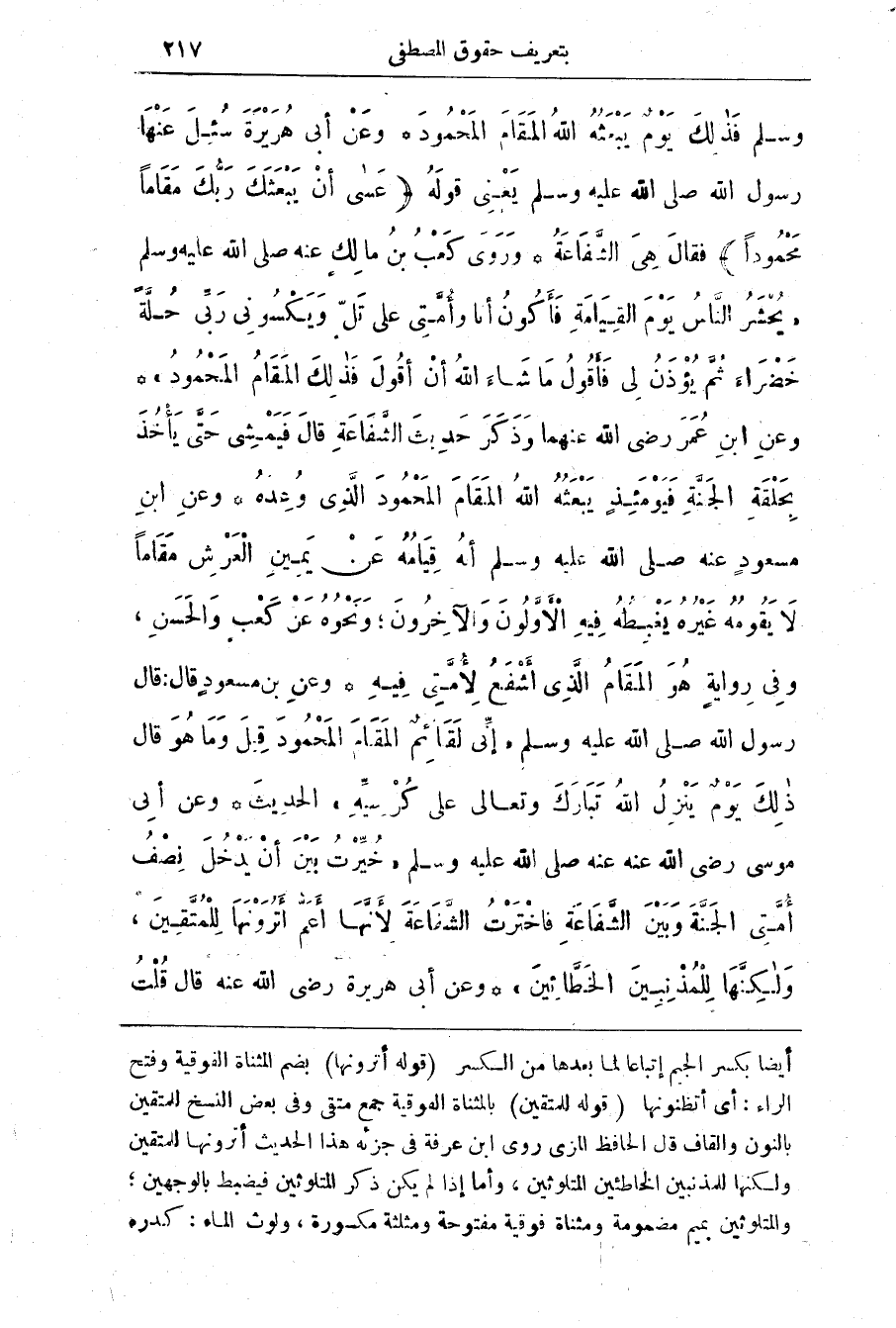 وَسَلَّمَ فَذَلِكَ يَوْمَ يَبْعَثُهُ اللَّهُ الْمَقَامَ الْمَحْمُودَ) وَعَنْ أَبِي هُرَيْرَةَ سُئِلَ عَنْهَا رَسُولُ اللَّه صَلَّى اللَّهُ عَلَيْهِ وَسَلَّمَ يَعْنِي قَوْلَهُ (عَسَى أَنْ يَبْعَثَكَ رَبُّكَ مقاما محمودا) فقال هي الشَّفَاعَةُ * وَرَوَى كَعْبُ بنُ مَالِكِ عَنْهُ صَلَّى اللَّهُ عَلَيْهِ وَسَلَّمَ (يُحْشَرُ النَّاسِ يَوْمَ الْقِيَامَةِ فَأَكُونُ أَنَا وَأُمَّتِي عَلَى تَلّ وَيَكْسُونِي رَبّي حُلَّةً خَضْرَاءَ ثُمَّ يُؤْذَنُ لِي فَأَقُولُ مَا شَاءَ اللَّه أَنْ أَقُولَ فَذَلِكَ الْمَقَامُ الْمَحْمُودُ) * وَعَنِ ابن عُمَرَ رَضِيَ اللَّه عَنْهُمَا وَذَكَرَ حَدِيث الشَّفَاعَة قَالَ فَيَمْشِي حَتَّى يَأْخُذَ بِحَلْقَةِ الْجَنةِ فَيَوْمَئِذٍ يَبْعَثُهُ اللَّه الْمَقَامَ الْمَحْمُودَ الَّذِي وُعِدَهُ * وَعَنِ ابن مَسْعُودٍ عَنْهُ صَلَّى اللَّهُ عَلَيْهِ وَسَلَّمَ أنَّهُ قِيَامُهُ عَنْ يَمِينِ الْعَرْشِ مَقَامًا لَا يَقُومُهُ غَيْرُهُ يَغْبِطُهُ فِيهِ الْأَوَّلُونَ وَالآخِرُونَ، وَنَحْوُهُ عَنْ كَعْب وَالْحَسَن، وَفِي رِوَايَة هُوَ الْمَقَامُ الَّذِي أشْفَعُ لِأُمَّتِي فِيهِ * وَعَنِ ابن مَسْعُودٍ قَالَ: قَالَ رَسُولُ اللَّه صَلَّى اللَّهُ عَلَيْهِ وَسَلَّمَ (إِنِّي لَقَائِمٌ الْمَقَامَ الْمَحْمُودَ قِيلَ وَمَا هُوَ قَالَ ذَلِكَ يَوْمَ يَنْزِلُ اللَّهُ تَبَارَكَ وَتَعَالَى عَلَى كُرْسِيِّهِ) الْحَدِيثَ * وَعَنْ أَبِي مُوسَى رَضِيَ اللَّهُ عَنْهُ عَنْهُ صَلَّى القله عَلَيْهِ وَسَلَّمَ (خُيِّرْتُ بَيْنَ أَنْ يَدْخُلَ نِصْفُ أُمَّتِي الْجَنَّةَ وَبَيْنَ الشَّفَاعَةِ فَاخْتَرْتُ الشَّفَاعَةَ لِأَنَّهَا أَعَمُّ أَتَرْونَهَا لِلْمُتَّقِينَ، وَلَكِنَّهَا لِلْمُذْنِبِينَ الْخَطَّائِينَ) * وَعَنْ أَبِي هُرَيْرَةَ رَضِيَ اللَّهُ عَنْهُ قَالَ قُلْتَ