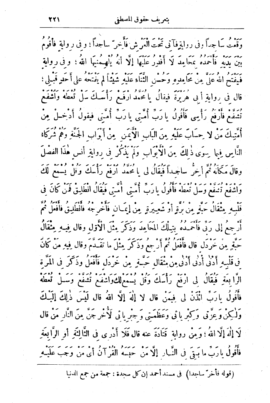 بَيْنَ يَدَيْهِ فَأَحْمَدُهُ بِمَحَامِدَ لَا أَقْدِرُ عَلَيْهَا إِلَّا أَنَّهُ يُلْهِمُنِيهَا اللَّهُ، وَفِي رِوَايَةٍ فَيَفْتَحُ اللَّهُ عَلَيَّ مِنْ مَحَامِدِهِ وَحُسْنِ الثَّنَاءِ عَلَيْهِ شَيْئًا لَمْ يَفْتَحْهُ عَلَى أَحَدٍ قَبْلِي، قَالَ فِي رِوَايَةِ أَبِي هُرَيْرَةَ فَيُقَالُ يَا مُحَمَّدُ ارْفَعْ رَأْسَكَ سَلْ تُعْطَهْ وَاشْفَعْ تُشَفَّعْ فَأَرْفَعُ رَأْسِي فَأَقُولُ يَا رَبِّ أُمَّتِي يَا رَبِّ أُمَّتِي فَيَقُولُ أَدْخِلْ مِنْ أُمَّتِكَ مَنْ لَا حِسَابَ عَلَيْهِ مِنَ الْبَابِ الْأَيْمَنِ مِنْ أَبْوَابِ الْجَنَّةِ وَهُمْ شُرَكَاءُ النَّاسِ فِيمَا سِوَى ذَلِكَ مِنَ الْأَبْوَابِ وَلَمْ يَذْكُرْ فِي رِوَايَةِ أَنَسٍ هَذَا الْفَصْلَ وَقَالَ مَكَانَهُ ثُمَّ أَخِرُّ سَاجِدًا فَيُقَالُ لِي يَا مُحَمَّدُ ارْفَعْ رَأْسَكَ وَقُلْ يُسْمَعْ لَكَ واشفع تشفع وسل تُعْطَهْ فَأَقُولُ يَا رَبِّ أُمَّتِي أُمَّتِي فَيُقَالُ انْطَلِقْ فَمَنْ كَانَ فِي قَلْبِهِ مِثْقَالُ حَبَّةٍ مِنْ بُرَّةٍ أَوْ شَعِيرَةٍ مِنْ إِيمَانٍ فَأَخْرِجْهُ فَأَنْطَلِقُ فَأَفْعَلُ ثُمَّ أَرْجِعُ إِلَى رَبِّي فَأَحْمَدُهُ بِتِلْكَ الْمَحَامِدِ وَذَكَرَ مِثْلَ الأَوَّلِ وَقَالَ فِيهِ مِثْقَالُ حَبَّةٍ مِنْ خَرْدَلٍ قَالَ فَأَفْعَلُ ثُمَّ أَرْجِعُ وَذَكَرَ مِثْلَ مَا تَقَدَّمَ وَقَالَ فِيهِ مَنْ كَانَ فِي قَلْبِهِ أَدْنَى أدنى أَدْنَى مِنْ مِثْقَالِ حَبَّةٍ مِنْ خَرْدَلٍ فَأَفْعَلُ وَذَكَرَ فِي الْمَرَّةِ الرَّابِعَةِ فَيُقَالُ لِي ارْفَعْ رَأْسَكَ وَقُلْ يُسْمَعْ لَكَ واشفع تشفع وسل تُعْطَهْ فَأَقُولُ يَا رَبِّ ائْذَنْ لِي فِيمَنْ قَالَ لَا إِلهَ إِلَّا اللَّهُ قَالَ لَيْسَ ذَلِكَ إِلَيْكَ وَلَكِنْ وَعِزَّتِي وَكِبْرِيَائِي وَعَظَمَتِي وَجِبْرِيَائِي لأُخْرِجَنَّ مِنَ النَّارِ مَنْ قَالَ لَا إِلَهَ إِلَّا اللَّهُ، وَمِنْ رِوَايَةِ قَتَادَةَ عَنْهُ قَالَ فَلَا أَدْرِي فِي الثَّالِثَةِ أَوِ الرَّابِعَةِ فَأَقُولُ يَا رَبِّ مَا بَقِيَ فِي النَّارِ إِلَّا مَنْ حَبَسَهُ الْقُرْآنُ أَيْ مَنْ وَجَبَ عَلَيْهِ
