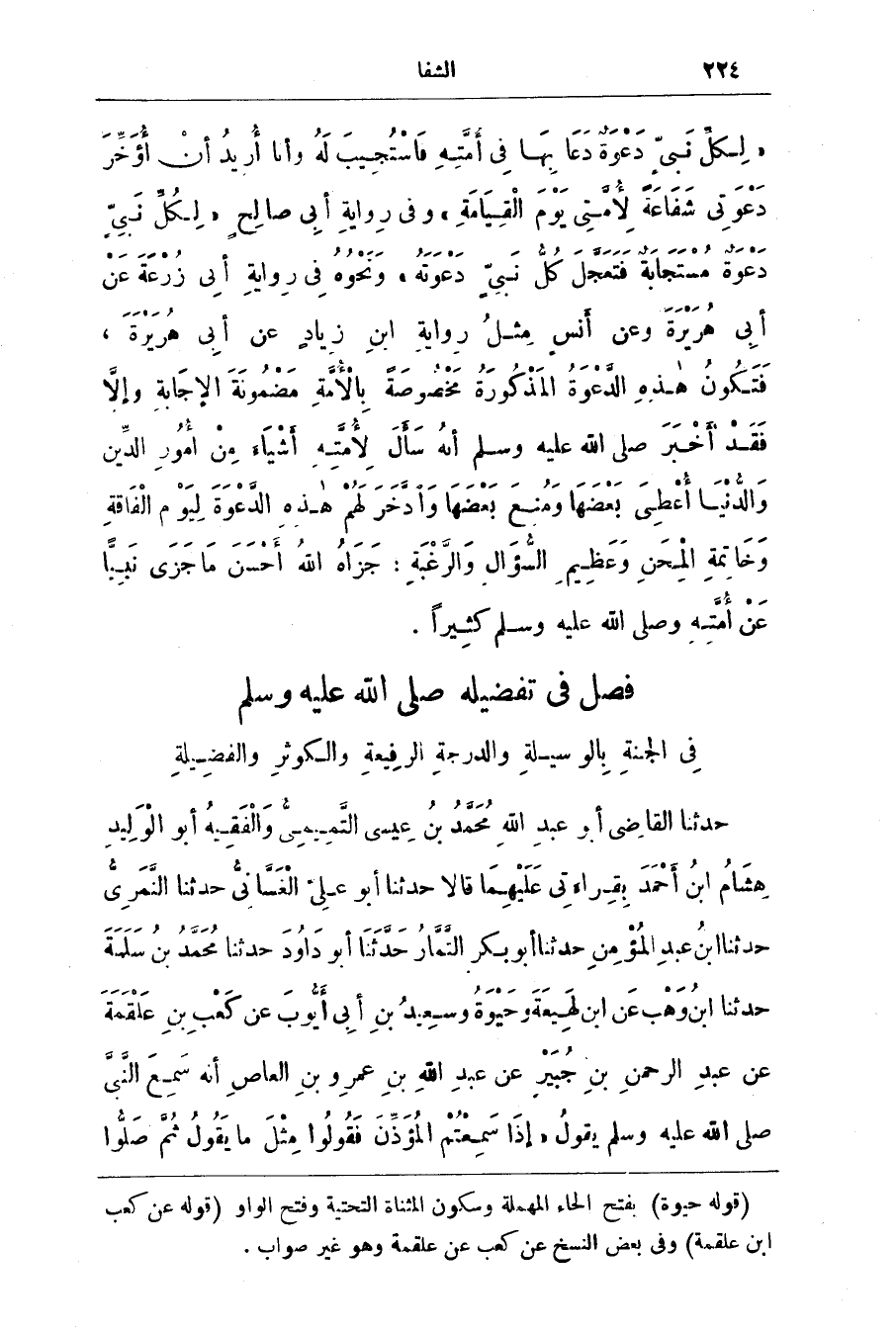 فصل فِي تفضيله صَلَّى اللَّهُ عَلَيْهِ وَسَلَّمَ فِي الْجَنةِ بالوسيلة والدرجة الرفيعة والكوثر والفضيلة حَدَّثَنَا الْقَاضِي أَبُو عَبْدِ اللَّه مُحَمَّدُ بْنُ عِيسَى التَّمِيمِيُّ وَالْفَقِيهُ أَبُو الْوَلِيدِ هِشَامُ بْنُ أَحْمَدَ بِقِرَاءَتِي عَلَيْهِمَا قَالَا حَدَّثَنَا أَبُو عَلِيٍّ الْغَسَّانِيُّ حَدَّثَنَا النَّمَرِيُّ حَدَّثَنَا ابْنُ عَبْدِ الْمُؤْمِنِ حَدَّثَنَا أَبُو بَكْرٍ التَّمَّارُ حَدَّثَنَا أَبُو دَاوُدَ حَدَّثَنَا مُحَمَّدُ بْنُ سَلَمَةَ حَدَّثَنَا ابْنُ وَهْبٍ عَنِ ابْنِ لَهِيعَةَ وَحَيْوَةَ وسَعِيدِ بْنِ أَبِي أَيُّوبَ عَنْ كَعْبِ بْنِ عَلْقَمَةَ عَنْ عَبْدِ الرَّحْمنِ بْنِ جُبَيْرٍ عَنْ عَبْدِ اللَّهِ بْنِ عَمْرِو بْنِ الْعَاصِ أَنَّهُ سَمِعَ النَّبِيَّ صَلَّى اللَّهُ عَلَيْهِ وَسَلَّمَ يَقُولُ (إِذَا سَمِعْتُمُ الْمُؤَذِّنَ فَقُولُوا مِثْلَ مَا يَقُولُ ثُمَّ صَلُّوا