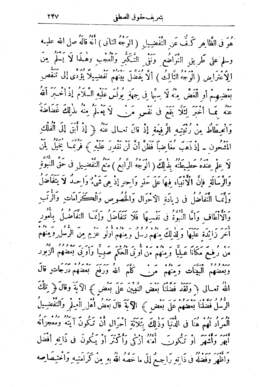 هُوَ فِي الظَّاهِرِ كَفَّ عَنِ التَّفْضِيلِ (الْوَجْهُ الثَّانِي) أَنَّهُ قَالَهُ صَلَّى اللَّهُ عَلَيْهِ وَسَلَّمَ عَلَى طَرِيقِ التَّوَاضُعِ وَنَفْيِ التَّكَبُّرِ وَالْعُجْبِ وَهَذَا لَا يَسْلَمُ مِنَ الاعْتِراضِ (الْوَجْهُ الثالث) أَلَّا يُفَضَّلَ بَيْنَهُمْ تضيلا يُؤَدِّي إِلَى تَنَقُّصِ بَعْضِهِمْ أَوِ الْغَضِّ مِنْهُ لَا سِيَّمَا فِي جِهَةِ يُونُسَ عَلَيْهِ السَّلَامُ إِذْ أَخْبَرَ اللَّهُ عَنْهُ بِمَا أَخْبَرَ لِئَلا يَقَعَ فِي نَفْسِ مَنْ لَا يَعْلَمُ مِنْهُ بِذَلِكَ غَضَاضَةٌ وَانْحِطَاطٌ مِنْ رُتْبَتِهِ الرَّفِيعَةِ إِذْ قَالَ تَعَالَى عَنْهُ (إِذْ أَبَقَ إِلَى الْفُلْكِ المشحون - إِذْ ذَهَبَ مُغَاضِبًا فَظَنَّ أَنْ لَنْ نَقْدِرَ عليه) فُرُبَّمَا يُخَيَّلُ لِمَنْ لَا عِلْمَ عِنْدَهُ حَطِيطَتُهُ بِذَلِكَ (الْوَجْهُ رابع) مَنْعُ التَّفْضِيلِ فِي حَقِّ النُّبُوَّةِ وَالرِّسَالَةِ فَإِنَّ الْأَنْبِيَاءَ فِيهَا عَلَى حَدٍّ وَاحِدٍ إِذْ هِيَ شئ وَاحِدٌ لَا يَتَفَاضَلُ وَإِنَّمَا التَّفَاضُلُ فِي زِيَادَةِ الْأَحْوَالِ وَالْخُصُوصِ وَالْكَرَامَاتِ وَالرُّتَبِ وَالْأَلْطَافِ وَأَمَّا النُّبُوَّةُ فِي نَفْسِهَا فَلَا تَتَفاضَلُ وَإِنَّمَا التَّفَاضُلُ بِأُمُورٍ أُخَرَ زَائِدَةٍ عَلَيْهَا وَلِذَلِكَ مِنْهُمْ رُسُلٌ وَمِنْهُمْ أُولُو عَزْمٍ مِنَ الرُّسُلِ وَمِنْهُمْ من رُفِعَ مَكَانًا عَليًّا وَمِنْهُمْ من أُوتِيَ الْحُكْمَ صَبِيًّا وأُوِتيَ بَعْضُهُمُ الزَّبُورَ
