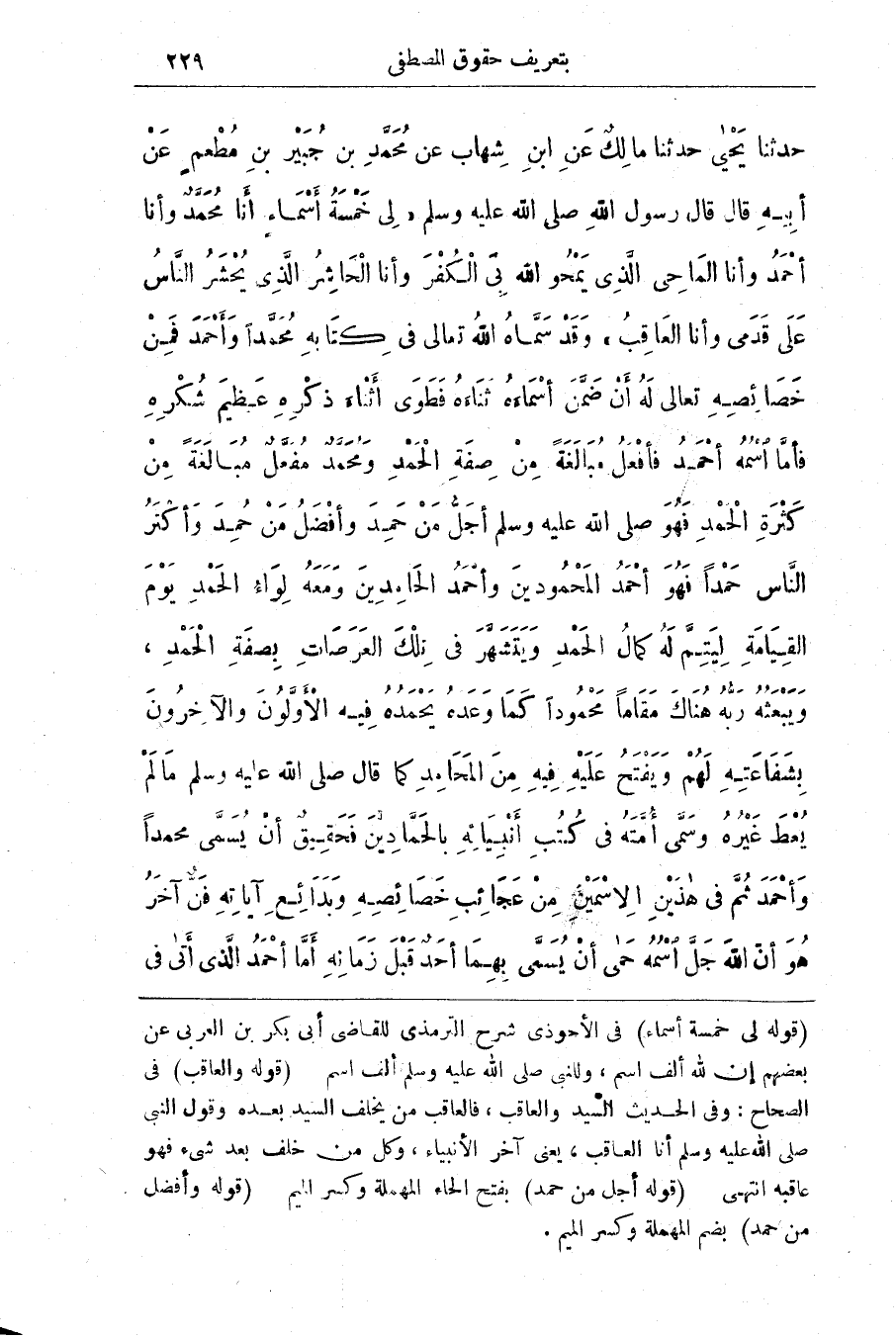 حَدَّثَنَا يَحْيَى حَدَّثَنَا مَالِكٌ عَنِ ابْنِ شِهَابٍ عَنْ مُحَمَّدِ بْنِ جُبَيْرِ بْنِ مُطْعِمٍ عَنْ أَبِيهِ قَالَ قَالَ رَسُولُ اللَّهِ صَلَّى اللَّهُ عَلَيْهِ وَسَلَّمَ (لِي خَمْسَةُ أَسْمَاءٍ أَنَا مُحَمَّدٌ وَأَنَا أَحْمَدُ وَأَنَا الْمَاحِي الَّذِي يَمْحُو اللَّهُ بِي الْكُفْرَ وَأَنَا الْحَاشِرُ الَّذِي يُحْشَرُ النَّاسُ عَلَى قَدَمِي وَأَنَا الْعَاقِبُ) وَقَدْ سَمَّاهُ اللَّه تَعَالَى فِي كِتَابِهِ مُحَمَّدًا وَأَحْمَدَ فَمِنْ خَصَائِصِهِ تَعَالَى لَهُ أَنْ ضَمَّنَ أَسْماءَهُ ثَنَاءَه فَطَوَى أَثْنَاء ذِكْرِهِ عَظِيمَ شُكْرِهِ فَأَمَّا اسْمُهُ أَحْمَدُ فَأَفْعَلُ مُبَالَغَةً من صِفَةِ الْحَمْدِ وَمُحَمَّدٌ مُفَعَّلٌ مُبالَغَةً من كَثْرَةِ الْحَمْدِ فهو صلى الله عليه وسلم أَجَلُّ من حَمِدَ وَأَفْضَلُ من حُمِدَ وَأَكْثَرُ النَّاسِ حَمْدًا فَهُوَ أَحْمَدُ الْمَحْمُودِينَ وَأَحْمَدُ الْحَامِدِينَ وَمَعَهُ لواء الحمد يوم القيامة وليتم لَهُ كَمَالُ الْحَمْدِ وَيَتَشَهَّرَ في تِلْكَ الْعَرَصَاتِ بِصِفَةِ الْحَمْدِ، وَيَبْعَثهُ رَبَّهُ هُنَاكَ مَقَامًا مَحْمُودًا كَمَا وَعَدهُ يَحْمَدُهُ فِيهِ الأوَّلُونَ وَالآخرُونَ بِشَفَاعِتِهِ لَهُمْ وَيَفْتَحُ عَلَيْهِ فِيهِ مِنَ الْمَحَامِدِ كَمَا قَالَ صَلَّى اللَّهُ عَلَيْهِ وَسَلَّمَ مَا لَمْ يُعْطَ غَيْرُهُ وَسَمَّى أُمَّتَهُ فِي كُتُبِ أَنْبِيَائِهِ بِالْحَمَّادِينَ فَحَقِيقٌ أَنْ يُسَمَّى مُحَمَّدًا وَأَحْمَدَ ثُمَّ فِي هَذَيْنِ الاسْمَيْنِ من عَجَائِبِ خَصَائِصِهِ وَبَدَائِعِ آيَاتِهِ فَنُّ آخَرُ هُوَ إن اللَّه جَلَّ اسْمُهُ حَمَى أَنْ يمسى بِهِمَا أَحَدٌ قَبْلَ زَمَانِهِ أَمَّا أَحْمَدُ الَّذِي أَتَى فِي