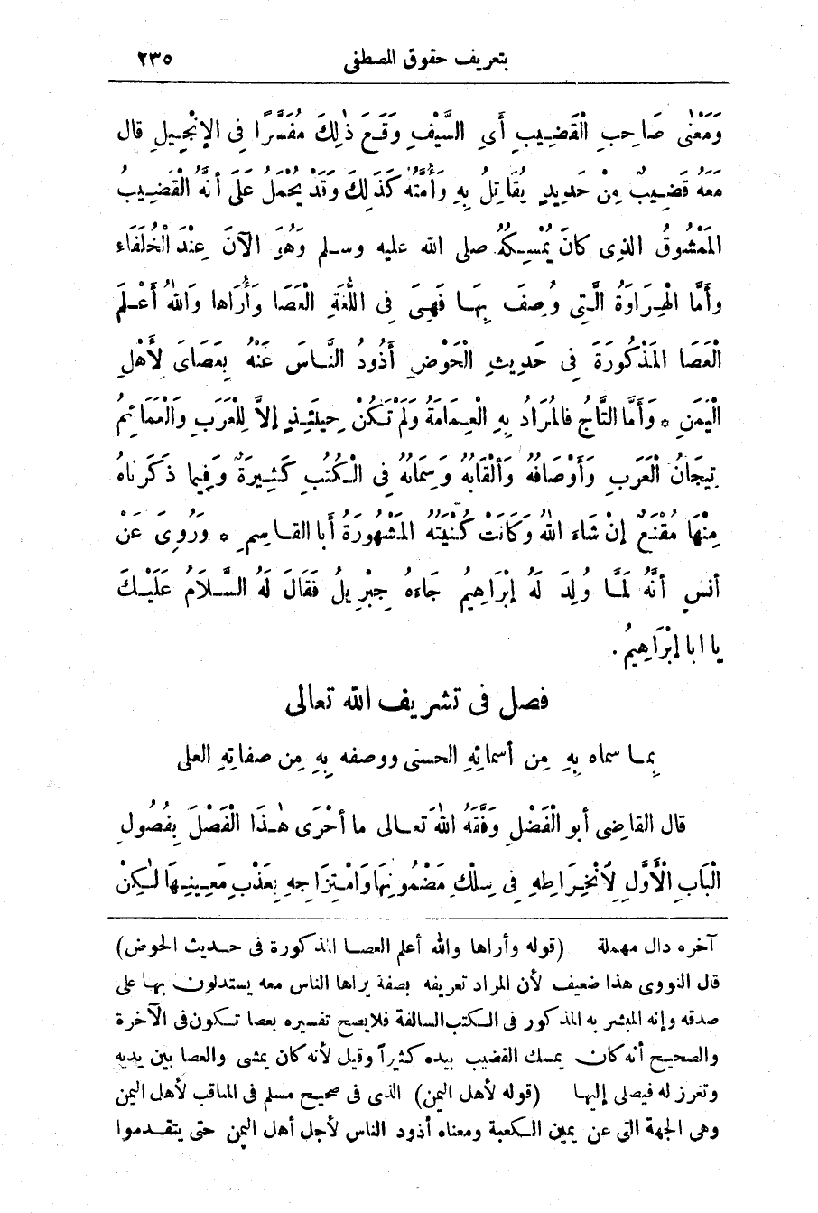فصل فِي تشريف اللَّه تَعَالَى بِمَا سَمَّاهُ بِهِ من أَسْمَائِهِ الْحُسْنَى وَوَصَفَهُ بِهِ من صِفَاتِهِ الْعُلَى قَالَ الْقَاضِي أَبُو الْفَضْلِ وَفَّقَهُ اللَّه تَعَالَى مَا أَحْرَى هَذَا الْفَصْلَ بِفُصول الْبَابِ الأَوَّلِ لانْخِرَاطِهِ فِي سلك مضمونها وامتراجه بِعَذْبِ مَعِينِهَا لَكِنْ