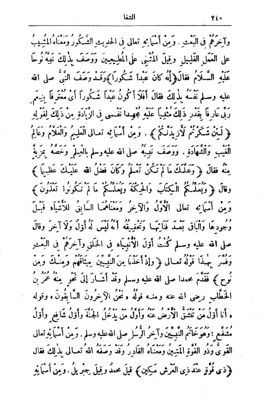 وَوَصَفَ نَبِيَّهُ صَلَّى اللَّهُ عَلَيْهِ وَسَلَّمَ بِالْعِلْمِ وَخصَّهُ بِمَزِيَّةٍ مِنْهُ فَقَالَ (وَعَلَّمَكَ مَا لَمْ تَكُنْ تَعْلَمُ وَكَانَ فَضْلُ اللَّهِ عَلَيْكَ عظيما) وَقَالَ (وَيُعَلِّمُكُمُ الْكِتَابَ وَالْحِكْمَةَ وَيُعَلِّمُكُمْ مَا لَمْ تَكُونُوا تَعْلَمُونَ) وَمِنْ أَسْمَائِهِ تَعَالَى الأَوَّلُ وَالآخِرُ وَمَعْنَاهُمَا السَّابِقُ لِلأَشْيَاءِ قَبْلَ وُجُودِهَا وَالْبَاقِي بَعْدَ فَنَائِهَا وَتَحْقِيقُهُ أَنَّهُ لَيْسَ لَهُ أَوَّلٌ وَلَا آخِرٌ وَقَالَ صَلَّى اللَّهُ عَلَيْهِ وَسَلَّمَ كُنْتُ أَوَّلَ الْأَنْبِيَاءِ فِي الْخَلْقِ وَآخِرَهُمْ فِي الْبَعْثِ وَفَسَّرَ بِهَذَا قَوْلَهُ تَعَالَى (وَإِذْ أَخَذْنَا مِنَ النَّبِيِّينَ مِيثَاقَهُمْ وَمِنْكَ وَمِنْ