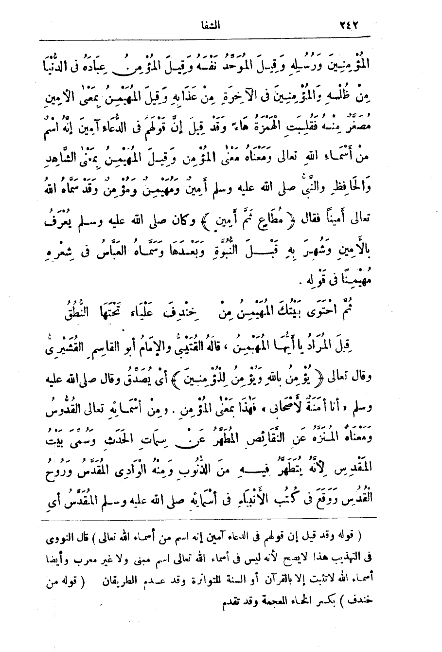 ثُمَّ احْتَوَى بَيْتُكَ الْمُهَيْمِنُ من * خِنْدِفَ عَلْيَاءَ تَحْتَهَا النُّطُقُ قِيلَ الْمُرَاد يَا أيُّهَا الْمُهَيْمِنُ، قَالَهُ الْقُتَيْبِيُّ وَالْإِمَامُ أَبُو الْقَاسِمِ الْقُشَيْرِيُّ وَقَالَ تَعَالَى (يُؤْمِنُ بِاللَّهِ وَيُؤْمِنُ لِلْمُؤْمِنِينَ) أَيْ يُصَدِّقُ وَقَالَ صَلَّى اللَّهُ عَلَيْهِ وَسَلَّمَ (أَنَا أَمَنَةٌ لِأصْحَابِي) فَهَذَا بِمَعْنَي الْمُؤْمِنِ.