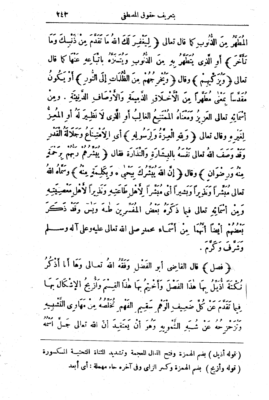 (فصل) قال القاضي أبو الفضل وفقه الله تَعَالَى وَهَا أَنَا أَذْكُرُ نُكْتَةً أُذَيِّلُ بِهَا هَذَا الْفَصْلِ وَأَخْتِمُ بِهَا هَذَا الْقِسْمَ وَأُزِيحُ الْإِشْكَالَ بها فِيمَا تَقَدَّمَ عَنْ كُلِّ ضَعِيفِ الْوَهْمِ سَقِيمِ الْفَهْمِ تخلصه من مَهَاوِي التَّشْبِيهِ وَتُزَحزحُهُ عَنْ شُبَهِ التَّمْويهِ وَهُوَ أنْ يَعْتَقِدَ أَنَّ اللَّه تَعَالَى جَلَّ اسْمُهُ